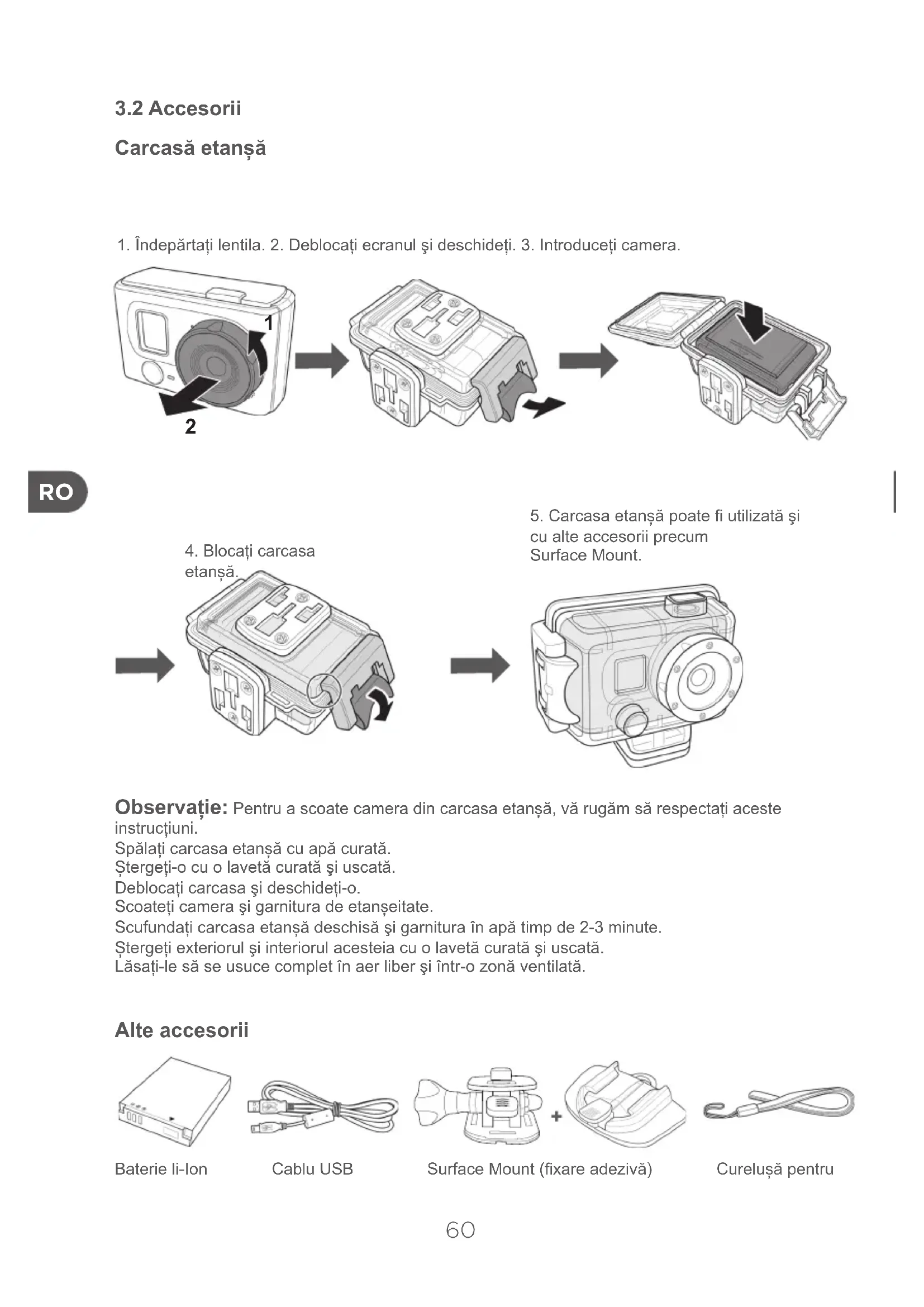 Carcasă etanșă Observație: Pentru a scoate camera din carcasa etanșă, vă rugăm să respectați aceste instrucțiuni. Spălați carcasa etanșă cu apă curată. Ștergeți-o cu o lavetă curată şi uscată. Deblocați carcasa şi deschideți-o. Scoateți camera şi garnitura de etanșeitate. Scufundați carcasa etanșă deschisă şi garnitura în apă timp de 2-3 minute. Ștergeți exteriorul şi interiorul acesteia cu o lavetă curată şi uscată. Lăsați-le să se usuce complet în aer liber şi într-o zonă ventilată. Alte accesorii Baterie li-Ion Cablu USB Surface Mount (xare adezivă) Curelușă pentru transport