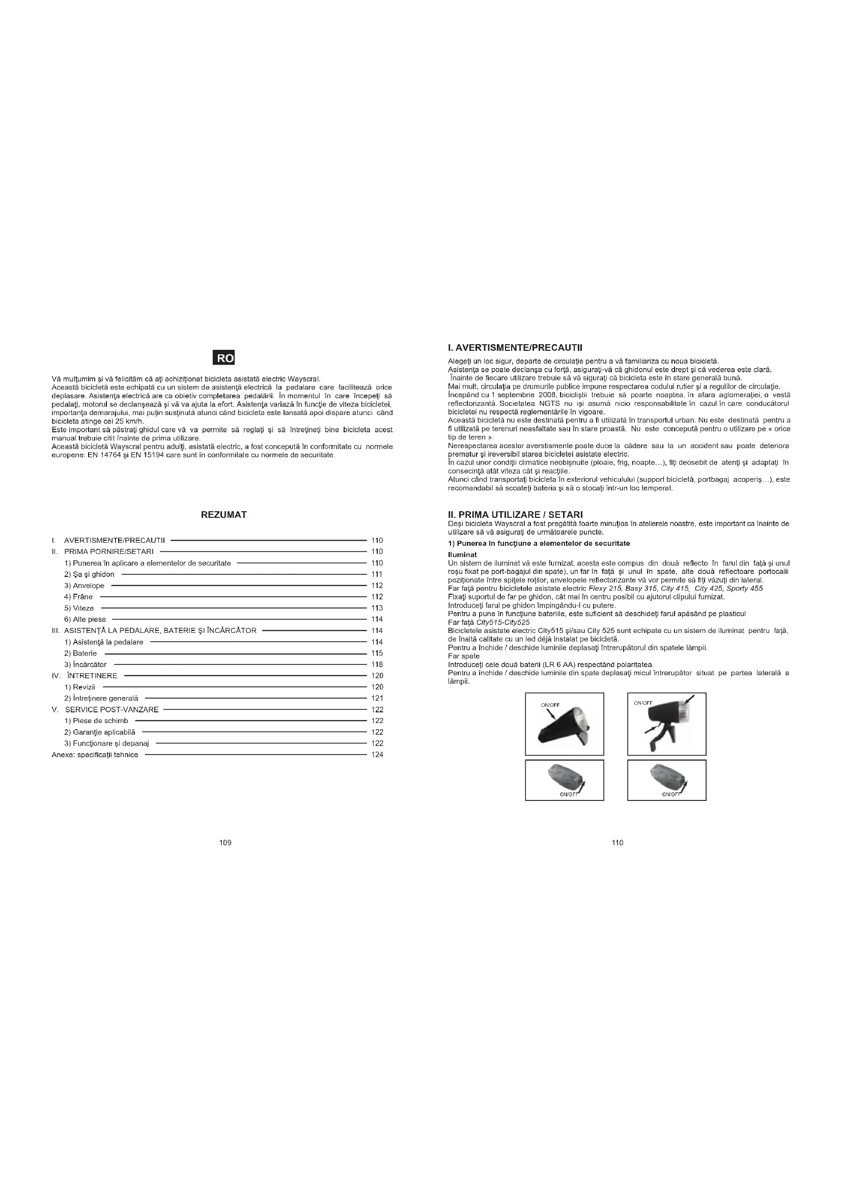 Vă mulţumim şi vă felicităm că aţi achiziţionat bicicleta asistată electric Wayscral. Această bicicletă este echipată cu un sistem de asistenţă electrică la pedalare care facilitează orice deplasare. Asistenţa electrică are ca obietiv completarea pedalării. În momentul în care începeţi să pedalaţi, motorul se declanşează şi vă va ajuta la efort. Asistenţa variază în funcţie de viteza bicicletei, importanţa demarajului, mai puţin susţinută atunci când bicicleta este lansată apoi dispare atunci când bicicleta atinge cei 25 km/h. Este important să păstraţi ghidul care vă va permite să reglaţi şi să întreţineţi bine bicicleta acest manual trebuie citit înainte de prima utilizare. Această bicicletă Wayscral pentru adulţi, asistată electric, a fost concepută în conformitate cu normele europene: EN 14764 şi EN 15194 care sunt în conformitate cu normele de securitate. REZUMAT