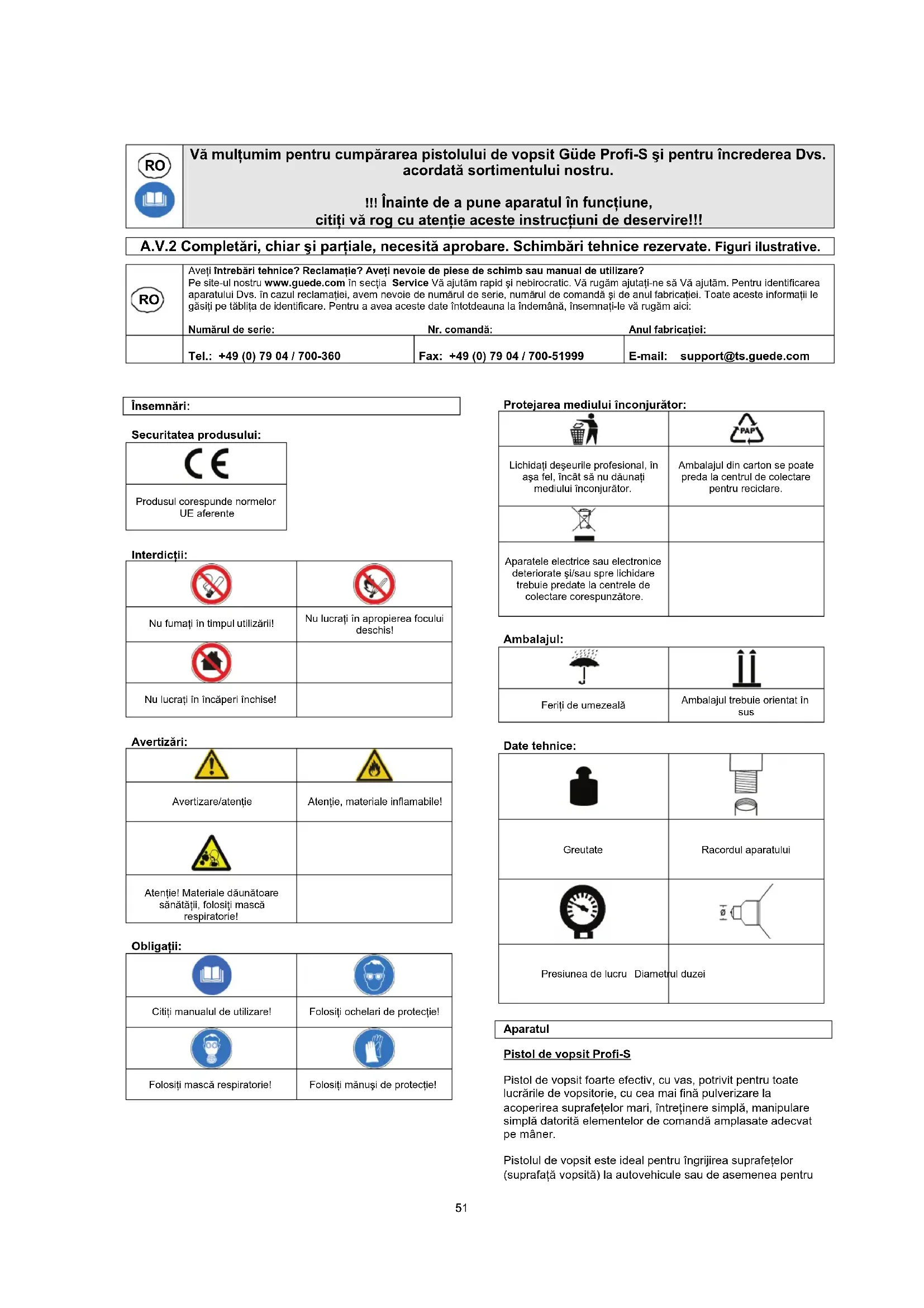 50RO Vă mulţumim pentru cumpărarea pistolului de vopsit Güde Profi-S şi pentru încrederea Dvs. acordată sortimentului nostru. !!! Înainte de a pune aparatul în funcţiune, citiţi vă rog cu atenţie aceste instrucţiuni de deservire!!! A.V.2 Completări, chiar şi parţiale, necesită aprobare. Schimbări tehnice rezervate. Figuri ilustrative.