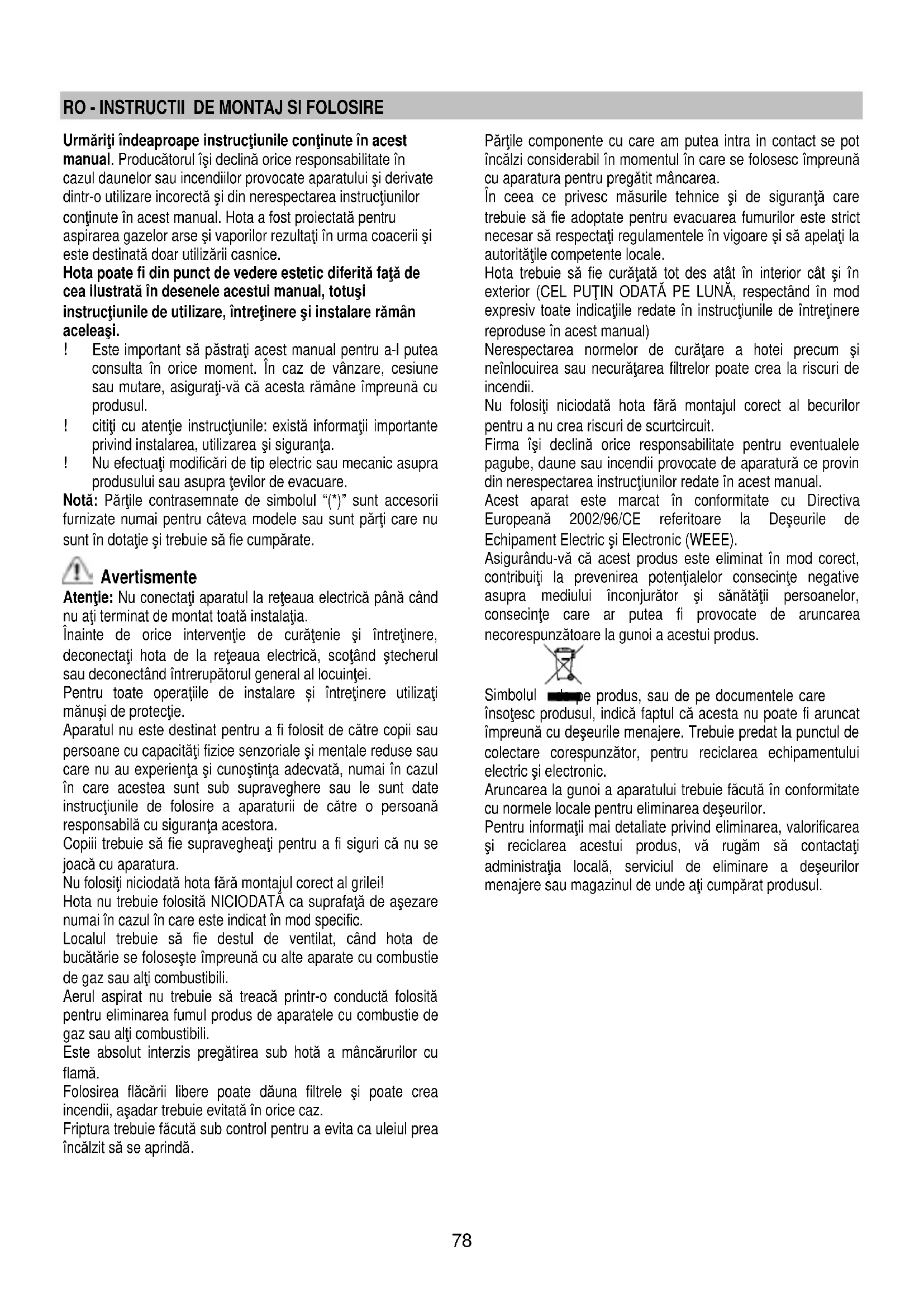 не прищраква). Ако ел. крушките не светят, проверете дали са монтирани правилно преди да потърсите помощта на специалист.78 RO - INSTRUCTII DE MONTAJ SI FOLOSIRE Urmăriţi îndeaproape instrucţiunile conţinute în acest manual. Producătorul îşi declină orice responsabilitate în cazul daunelor sau incendiilor provocate aparatului şi derivate dintr-o utilizare incorectă şi din nerespectarea instrucţiunilor conţinute în acest manual. Hota a fost proiectată pentru aspirarea gazelor arse şi vaporilor rezultaţi în urma coacerii şi este destinată doar utilizării casnice. Hota poate fi din punct de vedere estetic diferită faţă de cea ilustrată în desenele acestui manual, totuşi instrucţiunile de utilizare, întreţinere şi instalare rămân aceleaşi. ! Este important să păstraţi acest manual pentru a-l putea consulta în orice moment. În caz de vânzare, cesiune sau mutare, asiguraţi-vă că acesta rămâne împreună cu produsul. ! citiţi cu atenţie instrucţiunile: există informaţii importante privind instalarea, utilizarea şi siguranţa. ! Nu efectuaţi modificări de tip electric sau mecanic asupra produsului sau asupra ţevilor de evacuare. Notă: Părţile contrasemnate de simbolul “(*)” sunt accesorii furnizate numai pentru câteva modele sau sunt părţi care nu sunt în dotaţie şi trebuie să fie cumpărate. Avertismente Atenţie: Nu conectaţi aparatul la reţeaua electrică până când nu aţi terminat de montat toată instalaţia. Înainte de orice intervenţie de curăţenie şi întreţinere, deconectaţi hota de la reţeaua electrică, scoţând ştecherul sau deconectând întrerupătorul general al locuinţei. Pentru toate operaţiile de instalare și întreţinere utilizaţi mănuși de protecţie. Aparatul nu este destinat pentru a fi folosit de către copii sau persoane cu capacităţi fizice senzoriale şi mentale reduse sau care nu au experienţa şi cunoştinţa adecvată, numai în cazul în care acestea sunt sub supraveghere sau le sunt date instrucţiunile de folosire a aparaturii de către o persoană responsabilă cu siguranţa acestora. Copiii trebuie să fie supravegheaţi pentru a fi siguri că nu se joacă cu aparatura. Nu folosiţi n iciodată hota fără montajul corect al grilei! Hota nu trebuie folosită NICIODATĂ ca suprafaţă de aşezare numai în cazul în care este indicat în mod specific. Localul trebuie să fie destul de ventilat, când hota de bucătărie se foloseşte împreună cu alte aparate cu combustie de gaz sau alţi combustibili. Aerul aspirat nu trebuie să treacă printr-o conductă folosită pentru eliminarea fumul produs de aparatele cu combustie de gaz sau alţi combustibili. Este absolut interzis pregătirea sub hotă a mâncărurilor cu flamă. Folosirea flăcării libere poate dăuna filtrele şi poate crea incendii, aşadar trebuie evitată în orice caz. Friptura trebuie făcută sub control pentru a evita ca uleiul prea încălzit să se aprindă. Părţile componente cu care am putea intra in contact se pot încălzi considerabil în momentul în care se folosesc împreună cu aparatura pentru pregătit mâncarea. În ceea ce privesc măsurile tehnice şi de siguranţă care trebuie să f ie adoptate pentru evacuarea fumurilor este strict necesar să respectaţi regulamentele în vigoare şi să apelaţi la autorităţile competente locale. Hota trebuie să fie curăţată tot des atât în interior cât şi în exterior (CEL PUŢIN ODATĂ PE LUNĂ, respectând în mod expresiv toate indicaţiile redate în instrucţiunile de întreţinere reproduse în acest manual) Nerespectarea normelor de curăţare a hotei precum şi neînlocuirea sau necurăţarea filtrelor poate crea la riscuri de incendii. Nu folosiţi niciodată hota fără montajul corect al becurilor pentru a nu crea riscuri de scurtcircuit. Firma îşi declină orice responsabilitate pentru eventualele pagube, daune sau incendii provocate de aparatură ce provin din nerespectarea instrucţiunilor redate în acest manual. Acest aparat este marcat în conformitate cu Directiva Europeană 2002/96/CE referitoare la Deşeurile de Echipament Electric şi Electronic (WEEE). Asigurându-vă că acest produs este eliminat în mod corect, contribuiţi la prevenirea potenţialelor consecinţe negative asupra mediului înconjurător şi sănătăţii persoanelor, consecin ţe care a r putea fi provocate de aruncarea necorespunzătoare la gunoi a acestui produs. Simbolul de pe produs, sau de pe documentele care însoţesc produsul, indică faptul că acesta nu poate fi aruncat împreună cu deşeurile menajere. Trebuie predat la punctul de colectare corespunzător, pentru reciclarea echipamentului electric şi electronic. Aruncarea la gunoi a aparatului trebuie făcută în conformitate cu normele locale pentru eliminarea deşeurilor. Pentru informaţii mai detaliate privind eliminarea, valorificarea şi reciclarea acestui produs, vă rugăm să contactaţi administraţia locală, serviciul de eliminare a deşeurilor menajere sau magazinul de unde aţi cumpărat produsul.79 Utilizarea Hota a fost realizată pentru a fi utilizată în versiunea aspirantă cu evacuare externă sau în versiunea filtrantă cu riciclu intern. Versiunea aspirantă Vaporii sunt evacuaţi către exterior prin intermediul unui tub de evacuare fixat la flanşa de racord. Diametrul tubului de evacuare trebuie să fie echivalent cu diametrul inelului de conexiune. Atenţie! Tubul de evacuare nu se furnizează din dotare; acesta trebuie achiziţionat. În partea orizontală, tubul trebuie să aibă o înclinare uşoară în sus (circa 10°) pentru a putea transporta mai uşor aerul către exterior. Dacă hota este prevăzută cu filtre de carbon, acestea trebuie să fie scoase. Racordaţi hota la cablurile şi orificiile de evacuare prin perete cu diametru egal cu i