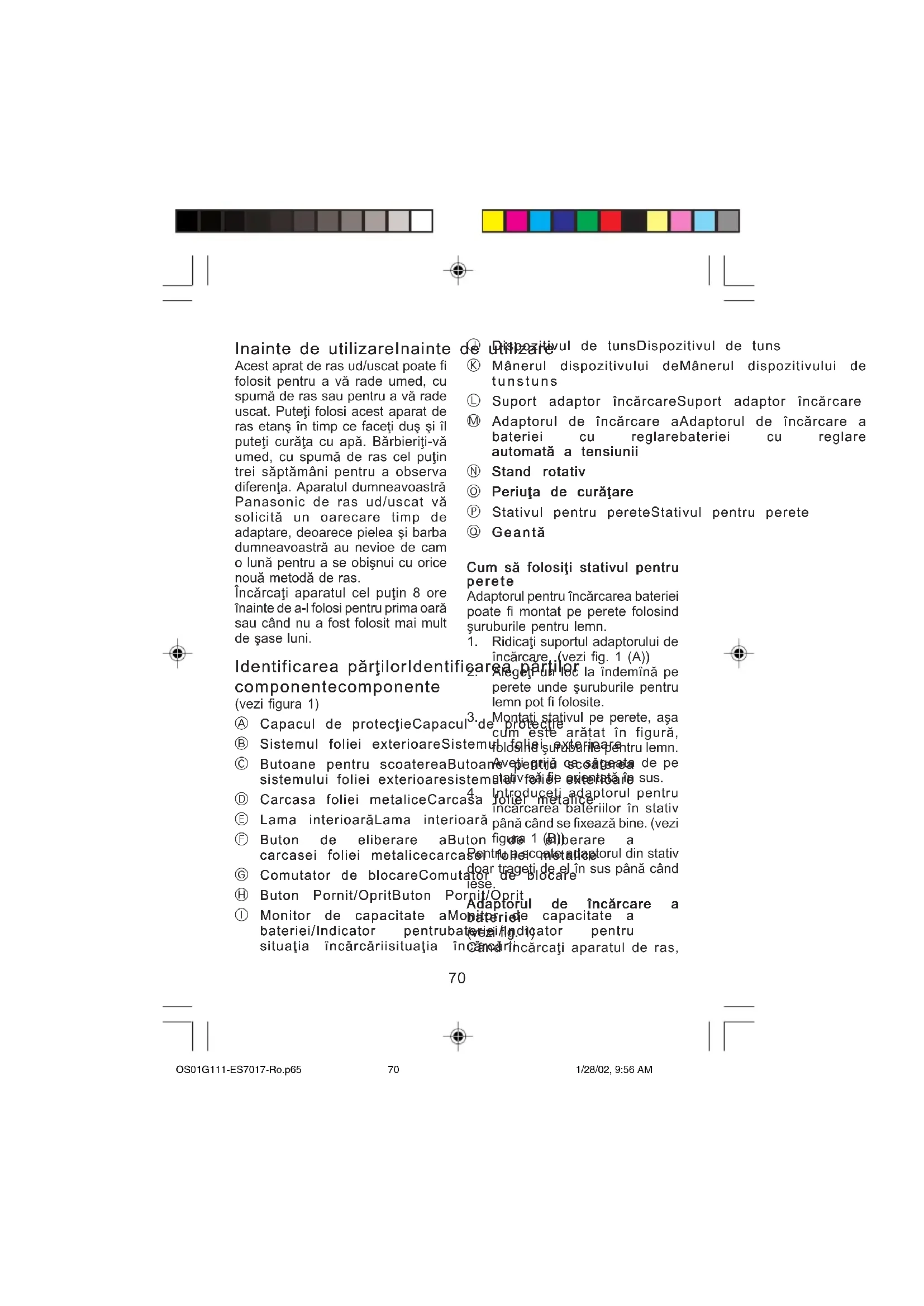 [nc`rcarea bateriilor [n stativ p@n` c@nd se fixeaz` bine. (vezi figura 1 (B)) Pentru a scoate adaptorul din stativ doar trage\i de el [n sus p@n` c@nd iese. Adaptorul de [nc`rcare aAdaptorul de [nc`rcare a Adaptorul de [nc`rcare aAdaptorul de [nc`rcare a Adaptorul de [nc`rcare a baterieibateriei baterieibateriei bateriei (vezi fig. 1) Când înc`rca\i aparatul de ras, OS01G111-ES7017-Ro.p65 1/28/02, 9:56 AM7071 ridica\i suportul adaptorului de înc`rcare pân` când se aude un clic. (vezi fig. 1(A)) (Extrage\i suportul adaptorului de înc`rcare în timpul transportului aparatului.) (vezi fig.1(C)) Baza suportului adaptorului de înc`rcare este rotativ`, în cazul în care ave\i nevoie de mai mult` stabilitate. (vezi fig.1(D)) {nc`rcarea{nc`rcarea {nc`rcarea{nc`rcarea {nc`rcarea (vezi figura 2) A]eza\i adaptorul pentru [nc`rcarea bateriei pe o suprafa\` plan` sau monta\i-l pe perete. Introduce\i adaptorul [ntr-o priz`. Adaptorul se va regla automat pentru o tensiune cuprins` [ntre 100 - 240V. {n unele zone s-ar putea s` ave\i nevoie de un ]techer special pentru adaptor. Pozi\iona\i comutatorul de pe aparat pe pozi\ia de [nc`rcare (“0 • charge position”) ]i apoi introduce\i-l [n adaptorul de [nc`rcare a bateriei, cu comutatorul c`tre [nainte. Lampa de înc`rcare va afi]a culoarea ro]ie când aparatul de ras este plasat în pozi\ia corect`. Lampa va afi]a un ro]u intermitent când procesul de înc`rcare s-a încheiat. În acela]i timp, monitorul de capacitate a bateriei va afi]a graficul de înc`rcare maxim` (vezi fig. 2 (A)). Sistemul se deconecteaz` în circa 10 minute dup` încheierea procesului de înc`rcare (vezi fig. 2 (B)). Pute\i înc`rca aparatul de ras la capacitatea maxim` într-o or`, dac` monitorul de înc`rcare a bateriei coboar` la nivelul de 20%. O [nc`rcare complet` a bateriei va furniza destul` energie [ncât s` v` rade\i de 20 de ori (trei minute pentru un ras dac` ave\i o barb` normal`). Pute\i \ine aparatul în înc`rc`tor în continuu, pentru a men\ine bateria la capacitatea maxim`. Aparatul nu poate fi supraînc`rcat. Înainte de c`l`torie, înc`rca\i-l la capacitatea maxim` timp de o or`, dac` nu inten\iona\i s` lua\i cu dvs adaptorul de înc`rcare. Cum s` utiliza\i aparatul dvsCum s` utiliza\i aparatul dvs Cum s` utiliza\i aparatul dvsCum s` utiliza\i aparatul dvs Cum s` utiliza\i aparatul dvs de rasde ras de rasde ras de ras |ine\i aparatul de ras la unghiul adecvat (90°) pe piele (vezi figura 3). Elibera\i butonul de blocare ]i [mpinge\i [n sus butonul On/Off (Pornit/Oprit) pentru a porni aparatul. {ncepe\i s` v` rade\i ap`s@nd u]or aparatul pe fa\`. {ntinde\i pielea cu cealalt` m@n` ]i mi]ca\i aparatul de ras [n sus ]i [n jos [n direc\ia b`rbii. Pute\i s` ap`sa\i mai tare dac` pielea dumneavoastr` s-a obi]nuit acest aparat. Ap`sarea mai puternic` a aparatului nu [nseamn` c` v` ve\i rade mai bine. Sistemul foliei exterioareSistemul foliei exterioare Sistemul foliei exterioareSistemul foliei exterioare Sistemul foliei exterioare (vezi figura 4) Sistemul foliei exterioare are o lam` striat` (a) între cele dou` folii de metal (site) (b). Acestea se mi]ca independent în sus si în jos pentru a putea urm`ri conturul fe\ei Dvs. Lama striat` prinde si taie mai u]or firele de p`r lungi si lipite de fa\`. OS01G111-ES7017-Ro.p65 1/28/02, 9:56 AM7172 Pentru b`rbierit umedPentru b`rbierit umed Pentru b`rbierit umedPentru b`rbierit umed Pentru b`rbierit umed Aplica\i un strat sub\ire de spum` de ras pe fa\`, care ac\ioneaz` ca unguent. Spuma de ras este cea mai potrivit` dintre multele cosmeticale pentru ras (s`pun, gel, crem`, etc.). Nu aplica\i un strat gros de spum` de ras pe fat`, deoarece nu este nevoie. Dac` capul aparatului se umple cu spum`, clati\i-l pur si simplu sub jet de ap`. Folosirea dispozitivuluiFolosirea dispozitivului Folosirea dispozitivuluiFolosirea dispozitivului Folosirea dispozitivului pentru tunspentru tuns pentru tunspentru tuns pentru tuns (vezi figura 5) Împinge\i dispozitivul de tuns în sus în pozi\ia pân` auzi\i un clic. A]eza\i aparatul de tuns [n unghiul corect pe pielea dumneavoastr` ]i mi]ca\i-l [n jos pentru a tunde perciunii. Cur`\area aparatului deCur`\area aparatului de Cur`\area aparatului deCur`\area aparatului de Cur`\area aparatului de rasras rasras ras (vezi figura 6) Din motive de igien`, v` recomand`m s` cur`\a\i aparatul dumneavoastr` de ras folosind ap` ]i s`pun lichid de m@ini. Cur`\irea regulat` a aparatului [l va men\ine [n condi\ii optime de func\iune, inclusiv [n ceea ce prive]te capacitatea de ras, [mpiedicand [n acela]i timp formarea unor depozite bacteriale sau mirosul nepl`cut. L`sa\i folia exterioar` la locul ei ]i turna\i peste ea s`pun. Porni\i aparatul de ras ]i turna\i ap` pe folia exterioar`. Peste 10-20 secunde opri\i aparatul. Extrage\i cadrul foliei ]i cur`\a\i-l sub jet de ap`. Sterge\i aparatul cu o cârp` uscat` si pân` la uscarea complet` nu pune\i carcasa de protec\ie pe folia exterioar`. Cur`\irea cu periu\aCur`\irea cu periu\a Cur`\irea cu periu\aCur`\irea cu periu\a Cur`\irea cu periu\a Ap`sa\i clamele foliei exterioare ]i trage\i foliile în sus, pentru a le extrage din aparat (vezi figura 7). Extrage\i lamele interioare apucându-le bine, de ambele capete, ]i tr`gându-le în afar` (vezi figura 8). Cur`\a\i foliile exterioare, corpul aparatului ]i dispozitivul de tuns cu partea lung` a periu\ei. Cur`\a\i lamele interioare cu partea scurt` a periu\ei. Nu folosi\i partea scurt` a periu\ei pentru a cur`\a foliile exterioare (vezi figura 9). {nlocuirea{nlocuirea {nlocuirea{nlocuirea {nlocuirea componentelor capuluicomponentelor capului componentelor capuluicomponentelor capului componentelor capului de rasde ras de rasde ras de ras E recomandat` înlocuirea foliei exterioare cel pu\in o dat` pe an ]i a lamelor interioare cel pu\in o dat` la doi ani, pentru a men\ine la nivel optim capacitatea de t`iere a aparatului dvs de ras. {nlocuirea sistemului foliei{nlocuirea sistemului foliei {nlocuire