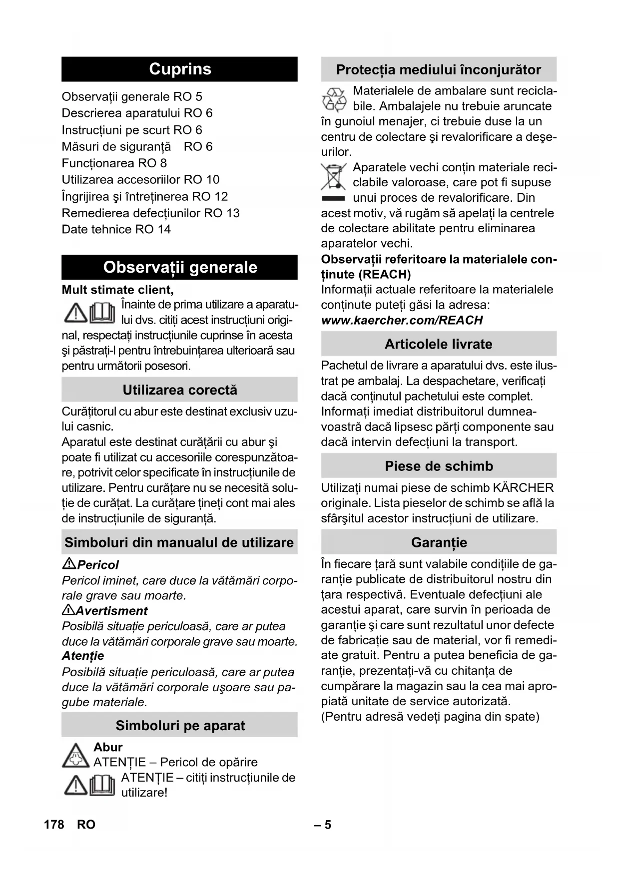 Conexiunea dintre cablul de alimentare şi prelungitor nu trebuie să se afle în apă. La înlocuirea racordurilor de la cablul de alimentare sau prelungitor trebuie asigurate protecţia la stropirea cu apă şi rezistenţa mecanică. Beneficiarul are obligaţia de a utiliza aparatul conform prevederilor. El trebu- ie să ţină cont de împrejurările de la faţa locului şi, în timpul lucrului, să fie atent la persoanele din preajmă. Acest aparat poate fi utilizat de către copiii de peste 8 ani şi persoane cu ca- pacităţi fizice, senzoriale sau mintale li- mitate sau de către persoane care nu dispun de experienţa sau cunoştinţa necesară doar atunci când sunt supra- vegheaţi şi au fost instruiţi în prealabil în legătură cu utilizarea sigură a aparatu- lui şi cunosc pericolele legate de aces- ta. Nu lăsaţi copiii să se joace cu aparatul. Curăţarea şi întreţinerea fieru- lui de călcat pot fi efectuate de copii doar dacă sunt nesupravegheaţi. Aparatul nu va fi lăsat să funcţioneze nesupravegheat. Atenţie la curăţarea pereţilor cu faianţă care au prize. Atenţie Atenţie la cablul de conectare sau la prelungitor, trebuie să fie în bună stare, nu îndoite, crăpate sau uzate, etc. Ca- blurile de reţea se vor proteja contra căldurii excesive, uleiurilor, muchiilor ascuţite. Nu introduceţi niciodată în rezervorul de apă solvenţi, lichizi cu conţinut de sol- venţi sau acizi nediluaţi (de ex. agenţi de curăţare, benzină, diluant sau aceto- nă), deoarece acestea atacă materiale- le utilizate pentru construcţia aparatului. Aparatul trebuie amplasat pe o suprafa- ţă de sprijin stabilă. Puneţi aparatul în funcţiune şi depozitaţi-l doar conform descrierilor şi a figurilor! Nu blocaţi niciodată maneta pentru abur în timpul utilizării aparatului. Feriţi aparatul de ploaie. Nu îl depozitaţi în spaţii deschise. Atenţie Dispozitivele de siguranţă servesc pentru protecţia utilizatorului şi nu este permisă modificarea sau scoaterea din funcţiune a acestora. Vă recomandăm, ca înainte de a utiliza cu- răţătorul cu abur să măturaţi sau să aspiraţi podeaua. Astfel podeaua va fi curăţată de murdărie/particule libere înainte de curăţa- rea umedă. În timpul întrebuinţării, regulatorul de presi- une menţine presiunea rezervorului la o va- loare cât mai constantă posibil. Dacă în rezervor se atinge presiunea maximă de funcţionare, încălzirea este oprită. Reporni- rea are loc dacă scade presiunea din rezer- vor, ca urmare a degajării aburului. Dacă regulatorul de presiune şi termostatul cazanului nu funcţionează din cauza unei defecţiuni şi aparatul se supraîncălzeşte, atunci termostatul de siguranţă opreşte aparatul. Pentru resetarea termostatului de siguranţă, adresaţi-vă unui service KÄR- CHER autorizat. Dispozitive de siguranţă Curăţarea suprefeţelor de pardoseală Regulatorul de presiune Termostatul de siguranţă 180 RO– 8 Capacul de siguranţă asigură închiderea rezervorului, nepermiţând aburului să iasă. Dacă s-a defectat regulatorul de presiune şi în rezervor are loc o creştere excesivă a presiunii, atunci în capacul de siguranţă se deschide o supapă de suprapresiune şi aburul poate fi evacuat prin capac. Înainte de repunerea în funcţiune a apara- tului, adresaţi-vă unui service KÄRCHER autorizat. Pentru imagini vezi pagina interioară! Figura Aplicaţi şi fixaţi rola de ghidare şi roţile de transport. Deschideţi capacul prizei aparatului. Introduceţi fişa pentru abur şi fixaţi-o în priza aparatului La introducerea în pri- ză, fişa trebuie să se fixeze perceptibil auditiv. Pentru deconectare: Apăsaţi în jos ca- pacul prizei aparatului şi trageţi din pri- ză fişa pentru abur. Figură + Cuplaţ i accesoriile necesare (vezi capi- tolul "Utilizarea accesoriilor") cu pistolul pentru abur. Pentru aceasta introduceţi capătul deschis al accesoriului pe pisto- lul de abur şi împingeţi-l pe pistol până când butonul de deblocare a pistolului de abur se fixează. Figura Dacă este necesar utilizaţi ţeava de prelungire. Pentru acesta conectaţi ţea- va sau ţevile de prelungire de pistolul de abur. Împingeţi accesoriul necesar pe capătul liber al ţevii de prelungire. Pericol În cazul detaşării unor accesorii, este posi- bilă scurgerea picăturilor de apă fierbinte ! Nu desprindeţi niciodată accesoriile în timp ce iese abur – pericol de arsuri ! Reglaţi selectorul pentru cantitatea de abur în spate (maneta pentru abur este blocată). Figura Pentru desprinderea accesoriilor, apă- saţi butonul de deblocare şi trageţi pie- sele una din alta. Notă: În cazul utilizării continue a apei dis- tilate din comerţ nu este necesară decalci- fierea rezervorului. Atenţie Nu utilizaţi apă de condens din uscătorul de rufe! Nu introduceţi soluţii de curăţat sau alţi aditivi! Desfaceţi capacul de siguranţă. Goliţi complet apa rămasă în rezervor (vezi figura ). Introduceţi în rezervor maxim 1 litru de apă proaspătă de la robinet. Observaţie: Apa caldă contribuie la re- ducerea timpului de încălzire. Înşurubaţi capacul de siguranţă la loc. Aşezaţi aparatul pe o suprafaţă stabilă. Atenţie Nu transportaţi aparatul în timpul lucrării de curăţare. Se introduce ştecherul în priză. Apăsaţi comutatorul de pornire pentru a porni aparatul. Ambele becuri de control trebuie să fie aprinse. Atenţie Porniţi aparatul numai, dacă în rezervor este apă. În caz contrar, aparatul se poate supraîncălzi (a se consulta posibilităţile de remediere din secţiunea Defecţiuni). După cca. 8 minute se stinge becul de control portocaliu – încălzire. Curăţătorul cu abur este gata de utilizare. Capacul de siguranţă Funcţionarea Montarea accesoriilor Desprinderea accesoriilor Umplerea cu apă Porniţi aparatul 181RO– 9 Cu ajutorul selectorului pentru cantitatea de abur puteţi reg