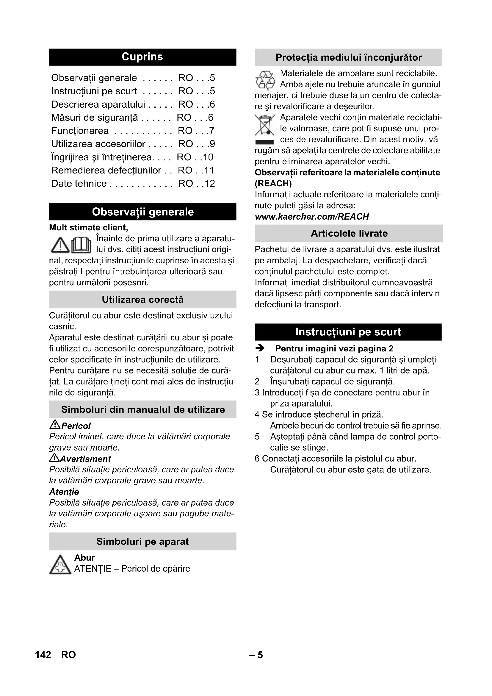• Stopień zabezpieczenia IP X4 Klasa ochrony I Parametry robocze Moc grzewcza 1500 W Moc grzewcza zelazko 750 W Maks. ciśnienie robocze 0,32 MPa Czas nagrzewania 8 minut maks. przepływ pary 40 g/min Wymiary Kocioł parowy 1,0 l Długość 380 mm Szerokość 254 mm Wysokość 260 mm Ciężar (bez akcesoriów) 2,9 kg 141PL– 5 Mult stimate client, Înainte de prima utilizare a aparatu- lui dvs. citiţi acest instrucţiuni origi- nal, respectaţi instrucţiunile cuprinse în acesta şi păstraţi-l pentru întrebuinţarea ulterioară sau pentru următorii posesori. Curăţitorul cu abur este destinat exclusiv uzului casnic. Aparatul este destinat curăţării cu abur şi poate fi utilizat cu accesoriile corespunzătoare, potrivit celor specificate în instrucţiunile de utilizare. Pentru curăţare nu se necesită soluţie de cură- ţat. La curăţare ţineţi cont mai ales de instrucţiu- nile de siguranţă. Pericol Pericol iminet, care duce la vătămări corporale grave sau moarte. 몇 Avertisment Posibilă situaţie periculoasă, care ar putea duce la vătămări corporale grave sau moarte. Atenţie Posibilă situaţie periculoasă, care ar putea duce la vătămări corporale uşoare sau pagube mate- riale. Abur ATENŢIE – Pericol de opărire Materialele de ambalare sunt reciclabile. Ambalajele nu trebuie aruncate în gunoiul menajer, ci trebuie duse la un centru de colecta- re şi revalorificare a deşeurilor. Aparatele vechi conţin materiale reciclabi- le valoroase, care pot fi supuse unui pro- ces de revalorificare. Din acest motiv, vă rugăm să apelaţi la centrele de colectare abilitate pentru eliminarea aparatelor vechi. Observaţii referitoare la materialele conţinute (REACH) Informaţii actuale referitoare la materialele conţi- nute puteţi găsi la adresa: www.kaercher.com/REACH Pachetul de livrare a aparatului dvs. este ilustrat pe ambalaj. La despachetare, verificaţi dacă conţinutul pachetului este complet. Informaţi imediat distribuitorul dumneavoastră dacă lipsesc părţi componente sau dacă intervin defecţiuni la transport. Pentru imagini vezi pagina 2 1Deşurubaţi capacul de siguranţă şi umpleţi curăţătorul cu abur cu max. 1 litri de apă. 2Înşurubaţi capacul de siguranţă. 3 Introduceţi fişa de conectare pentru abur în priza aparatului. 4 Se introduce ştecherul în priză. Ambele becuri de control trebuie să fie aprinse. 5Aşteptaţi până când lampa de control porto- calie se stinge. 6 Conectaţi accesoriile la pistolul cu abur. Curăţătorul cu abur este gata de utilizare. Cuprins Observaţii generale