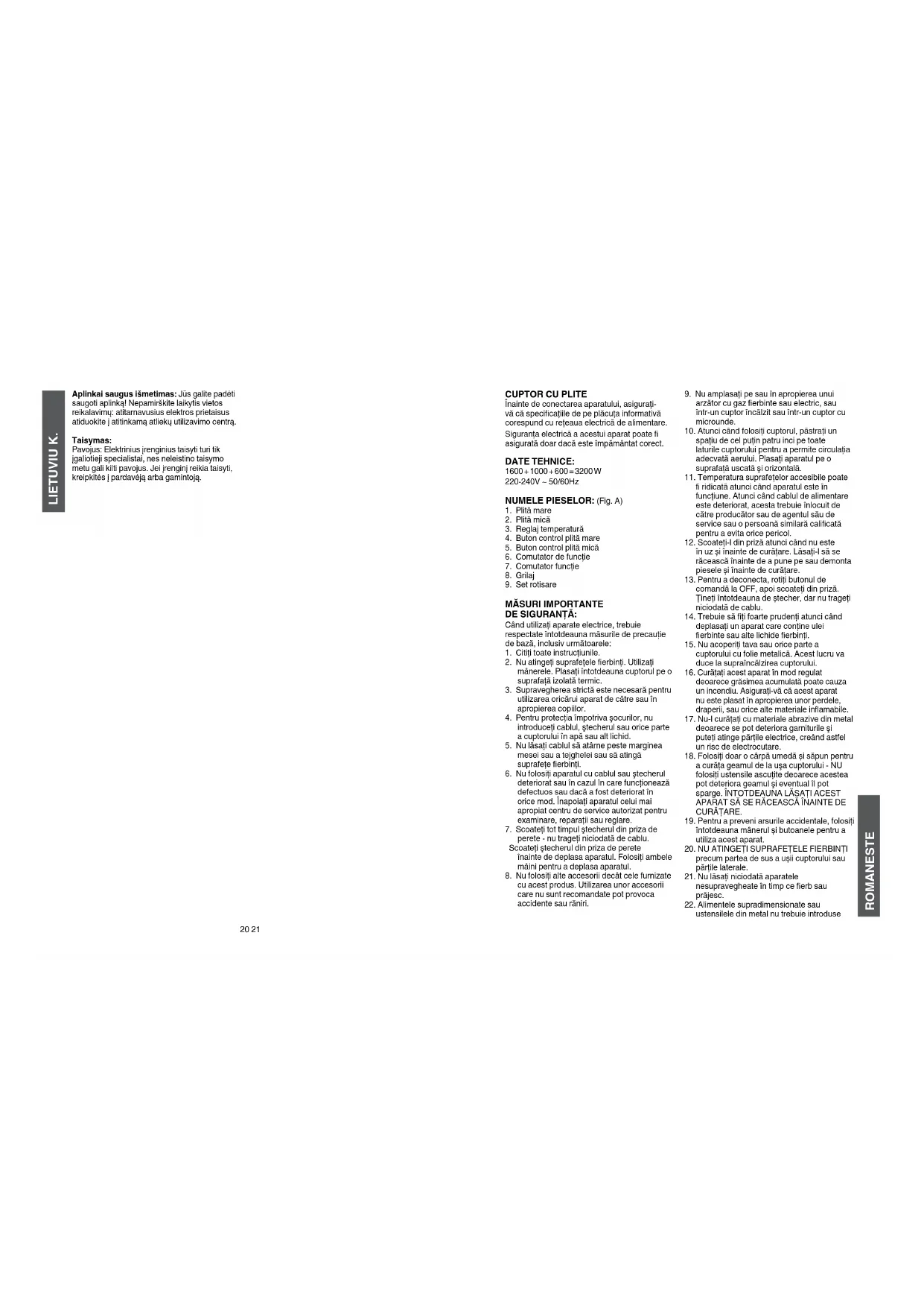 Înainte de conectarea aparatului, asiguraţi- vă că specicaţiile de pe plăcuţa informativă corespund cu reţeaua electrică de alimentare. Siguranţa electrică a acestui aparat poate asigurată doar dacă este împământat corect. DATE TEHNICE: 1600 + 1000 + 600 = 3200 W 220-240V ~ 50/60Hz NUMELE PIESELOR: (Fig. A)