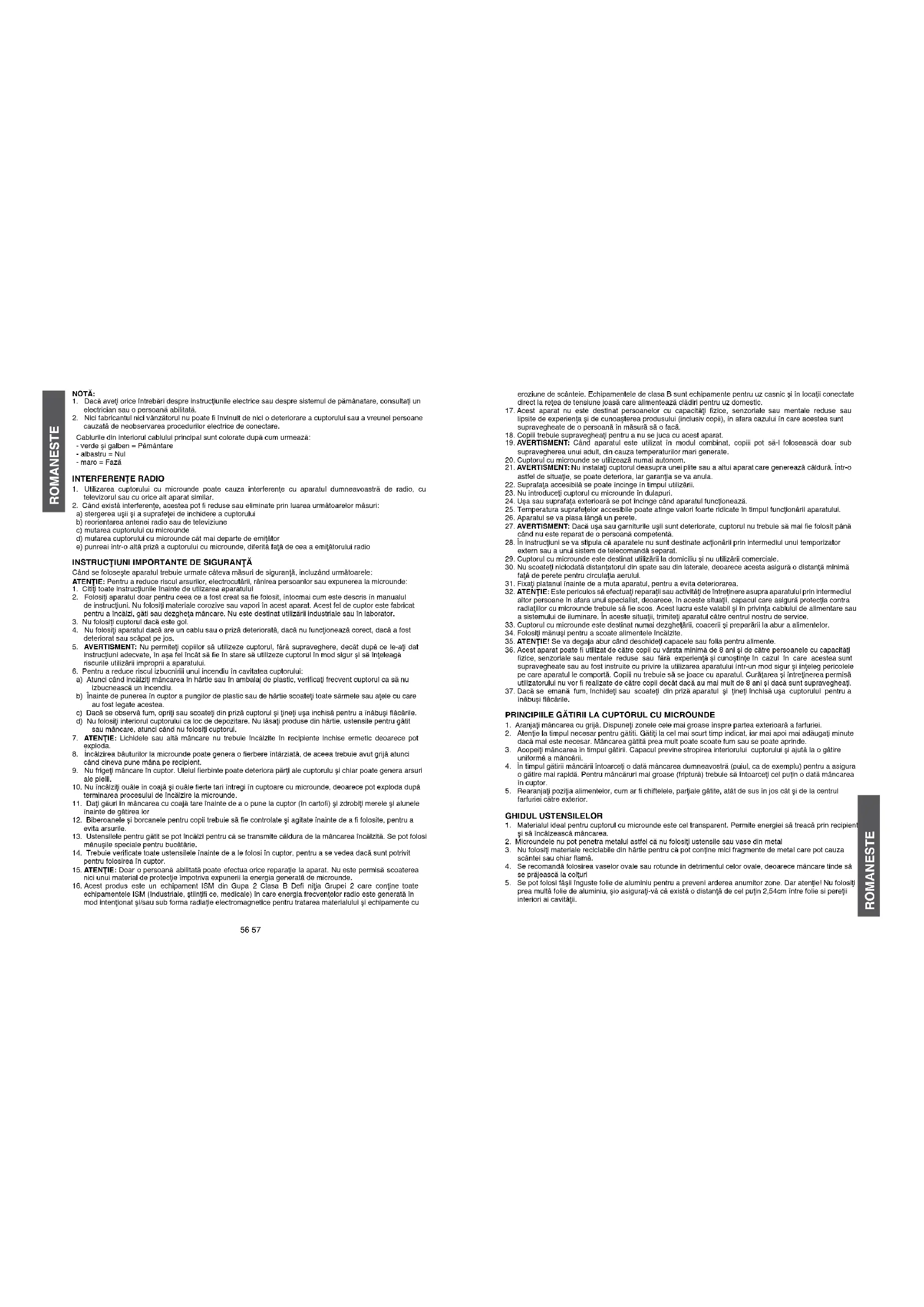 a) stergerea uşii şi a suprafeţei de inchidere a cuptorului b) reorientarea antenei radio sau de televiziune c) mutarea cuptorului cu microunde d) mutarea cuptorului cu microunde cât mai departe de emiţător e) punreai într-o altă priză a cuptorului cu microunde, diferită faţă de cea a emiţătorului radio INSTRUCŢIUNI IMPORTANTE dE SIGURANŢĂ Când se foloseşte aparatul trebuie urmate câteva măsuri de siguranţă, incluzând următoarele: ATENŢIE: Pentru a reduce riscul arsurilor, electrocutării, rănirea persoanlor sau expunerea la microunde: