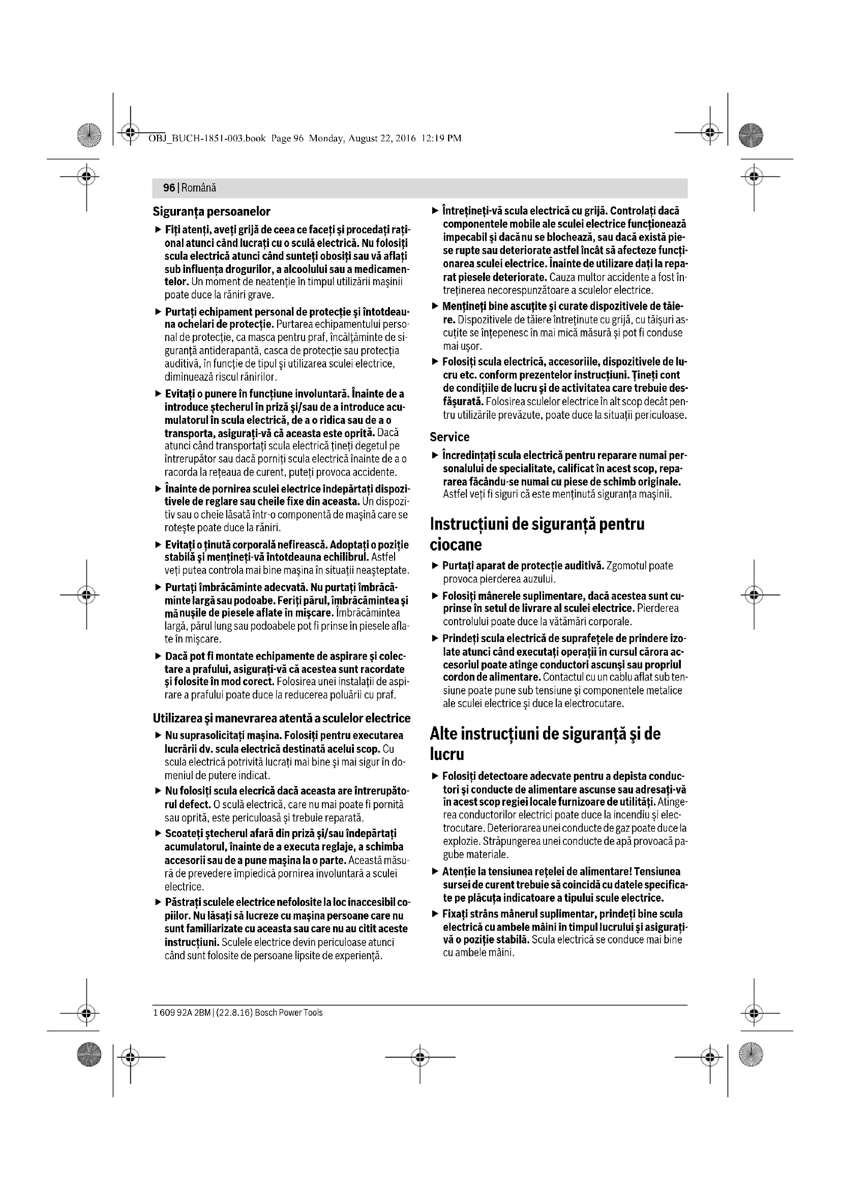 Кәдеге жарату Электр құралдар, жабдықтар және бумаларын айналаны қорғайтын кәдеге жаратуға апару қажет. Электр құрлдарды үй қоқысына тастамаңыз! Тек қана ЕО елдері үшін: Электр және электрондық ескі құралдар бойынша Еуропа 2012/19/EU ережесі және оның ұлттық заңдарда орындалуы бойынша басқа пайдаланып болмайтын электр құралдар бөлек жиналып кәдеге жаратылуы қажет. Техникалық өзгерістер енгізу құқығы сақталады. Română Indicaţii generale de avertizare pentru scule electrice Citiţi toate indicaţiile de avertiza- re şi instrucţiunile. Nerespectarea indicaţiilor de avertizare şi a instrucţiunilor poate provoca electrocutare, incendii şi/sau răniri grave. Păstraţi toate indicaţiile de avertizare şi instrucţiunile în vederea utilizărilor viitoare. Termenul de „sculă electrică“ folosit în indicaţiile de avertiza- re se referă la sculele electrice alimentate de la reţea (cu cablu de alimentare) şi la sculele electrice cu acumulator (fără cablu de alimentare). Siguranţa la locul de muncă Menţineţi-vă sectorul de lucru curat şi bine iluminat. Dezordinea sau sectoarele de lucru neluminate pot duce la accidente. Nu lucraţi cu scula electrică în mediu cu pericol de ex- plozie, în care există lichide, gaze sau pulberi inflama- bile. Sculele electrice generează scântei care pot aprinde praful sau vaporii. Nu permiteţi accesul copiilor şi al altor persoane în tim- pul utilizării sculei electrice. Dacă vă este distrasă aten- ţia puteţi pierde controlul asupra maşinii. Siguranţă electrică Ştecherul sculei electrice trebuie să fie potrivit prizei electrice. Nu este în nici un caz permisă modificarea ştecherului. Nu folosiţi fişe adaptoare la sculele electri- ce legate la pământ de protecţie. Ştecherele nemodifica- te şi prizele corespunzătoare diminuează riscul de electro- cutare. Evitaţi contactul corporal cu suprafeţe legate la pă- mânt ca ţevi, instalaţii de încălzire, sobe şi frigidere. Există un risc crescut de electrocutare atunci când corpul vă este legat la pământ. Feriţi maşina de ploaie sau umezeală. Pătrunderea apei într-o sculă electrică măreşte riscul de electrocutare. Nu schimbaţi destinaţia cablului folosindu-l pentru transportarea sau suspendarea sculei electrice ori pen- tru a trage ştecherul afară din priză. Feriţi cablul de căl- dură, ulei, muchii ascuţite sau componente aflate în mişcare. Cablurile deteriorate sau încurcate măresc riscul de electrocutare. Atunci când lucraţi cu o sculă electrică în aer liber, folo- siţi numai cabluri prelungitoare adecvate şi pentru me- diul exterior. Folosirea unui cablu prelungitor adecvat pentru mediul exterior diminuează riscul de electrocutare. Atunci când nu poate fi evitată utilizarea sculei electri- ce î n mediu umed, folosiţi un întrerupător automat de protecţie împotriva tensiunilor periculoase. Între- buinţarea unui întrerupător automat de protecţie împotri- va tensiunilor periculoase reduce riscul de electrocutare. AVERTISMENT OBJ_BUCH-1851-003.book Page 95 Monday, August 22, 2016 12:19 PM96 | Română 1 609 92A 2BM | (22.8.16) Bosch Power Tools Siguranţa persoanelor Fiţi atenţi, aveţi grijă de ceea ce faceţi şi procedaţi raţi- onal atunci când lucraţi cu o sculă electrică. Nu folosiţi scula electrică atunci când sunteţi obosiţi sau vă aflaţi sub influenţa drogurilor, a alcoolului sau a medicamen- telor. Un moment de neatenţie în timpul utilizării maşinii poate duce la răniri grave. Purtaţi echipament personal de protecţie şi întotdeau- na ochelari de protecţie. Purtarea echipamentului perso- nal de protecţie, ca masca pentru praf, încălţăminte de si- guranţă antiderapantă, casca de protecţie sau protecţia auditivă, în funcţie de tipul şi utilizarea sculei electrice, diminuează riscul rănirilor. Evitaţi o punere în funcţiune involuntară. Înainte de a introduce ştecherul în priză şi/sau de a introduce acu- mulatorul în scula electrică, de a o ridica sau de a o transporta, asiguraţi-vă că aceasta este oprit ă. Dacă atunci când transportaţi scula electrică ţineţi degetul pe întrerupător sau dacă porniţi scula electrică înainte de a o racorda la reţeaua de curent, puteţi provoca accidente. Înainte de pornirea sculei electrice îndepărtaţi dispozi- tivele de reglare sau cheile fixe din aceasta. Un dispozi- tiv sau o cheie lăsată într-o componentă de maşină care se roteşte poate duce la răniri. Evitaţi o ţinută corporală nefirească. Adoptaţi o poziţie stabilă şi menţineţi-vă întotdeauna echilibrul. Astfel veţi putea controla mai bine maşina în situaţii neaşteptate. Purtaţi îmbrăcăminte adecvată. Nu purtaţi îmbrăcă- minte largă sau podoabe. Feriţi părul, îmbrăcămintea şi