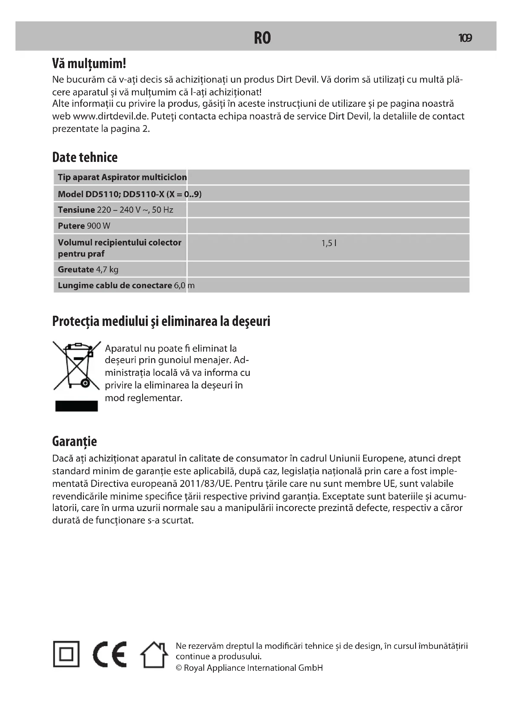 ELNe rezervăm dreptul la modicări tehnice şi de design, în cursul îmbunătăţirii continue a produsului. © Royal Appliance International GmbH Vă mulţumim! Ne bucurăm că v-aţi decis să achiziţionaţi un produs Dirt Devil. Vă dorim să utilizaţi cu multă plă- cere aparatul şi vă mulţumim că l-aţi achiziţionat! Alte informaţii cu privire la produs, găsiţi în aceste instrucţiuni de utilizare şi pe pagina noastră web www.dirtdevil.de. Puteţi contacta echipa noastră de service Dirt Devil, la detaliile de contact prezentate la pagina 2. Date tehnice Tip aparat Aspirator multiciclon Model DD5110; DD5110-X (X = 0..9) Tensiune 220 – 240 V ~, 50 Hz Putere 900 W Volumul recipientului colector pentru praf 1,5 l Greutate 4,7 kg Lungime cablu de conectare 6,0 m Protecţia mediului şi eliminarea la deşeuri Aparatul nu poate eliminat la deşeuri prin gunoiul menajer. Ad- ministraţia locală vă va informa cu privire la eliminarea la deşeuri în mod reglementar. Garanţie Dacă aţi achiziţionat aparatul în calitate de consumator în cadrul Uniunii Europene, atunci drept standard minim de garanţie este aplicabilă, după caz, legislaţia naţională prin care a fost imple- mentată Directiva europeană 2011/83/UE. Pentru ţările care nu sunt membre UE, sunt valabile revendicările minime specice ţării respective privind garanţia. Exceptate sunt bateriile şi acumu- latorii, care în urma uzurii normale sau a manipulării incorecte prezintă defecte, respectiv a căror durată de funcţionare s-a scurtat.