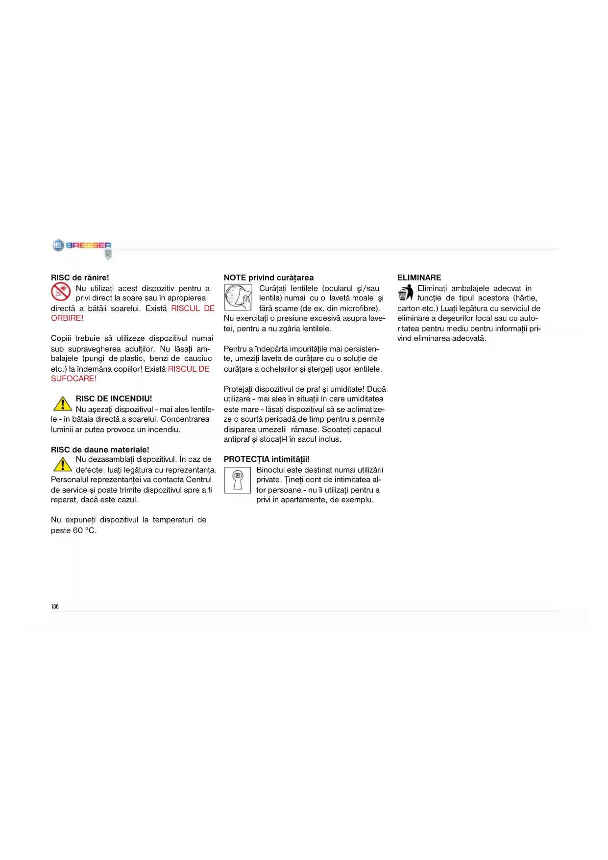 1(135 SK136 RISC de rănire! Nu utilizaţi acest dispozitiv pentru a privi direct la soare sau în apropierea directă a bătăii soarelui. Există RISCUL DE ORBIRE! Copiii trebuie să utilizeze dispozitivul numai sub supravegherea adulţilor. Nu lăsaţi am- balajele (pungi de plastic, benzi de cauciuc etc.) la îndemâna copiilor! Există RISCUL DE SUFOCARE! RISC DE INCENDIU! Nu aşezaţi dispozitivul - mai ales lentile- le - în bătaia directă a soarelui. Concentrarea luminii ar putea provoca un incendiu. RISC de daune materiale! Nu dezasamblaţi dispozitivul. În caz de defecte, luaţi legătura cu reprezentanţa. Personalul reprezentanţei va contacta Centrul de service şi poate trimite dispozitivul spre a fi reparat, dacă este cazul. Nu expuneţi dispozitivul la temperaturi de peste 60 °C. NOTE privind curăţarea Curăţaţi lentilele (ocularul şi/sau lentila) numai cu o lavetă moale şi fără scame (de ex. din microfibre). Nu exercitaţi o presiune excesivă asupra lave- tei, pentru a nu zgâria lentilele. Pentru a îndepărta impurităţile mai persisten- te, umeziţi laveta de curăţare cu o soluţie de curăţare a ochelarilor şi ştergeţi uşor lentilele. Protejaţi dispozitivul de praf şi umiditate! După utilizare - mai ales în situaţii în care umiditatea este mare - lăsaţi dispozitivul să se aclimatize- ze o scurtă perioadă de timp pentru a permite disiparea umezelii rămase. Scoateţi capacul antipraf şi stocaţi-l în sacul inclus. PROTECŢIA intimităţii! Binoclul este destinat numai utilizării private. Ţineţi cont de intimitatea al- tor persoane - nu îi utilizaţi pentru a privi în apartamente, de exemplu. ELIMINARE Eliminaţi ambalajele adecvat în funcţie de tipul acestora (hârtie, carton etc.) Luaţi legătura cu serviciul de eliminare a deşeurilor local sau cu auto- ritatea pentru mediu pentru informaţii pri- vind eliminarea adecvată.137
