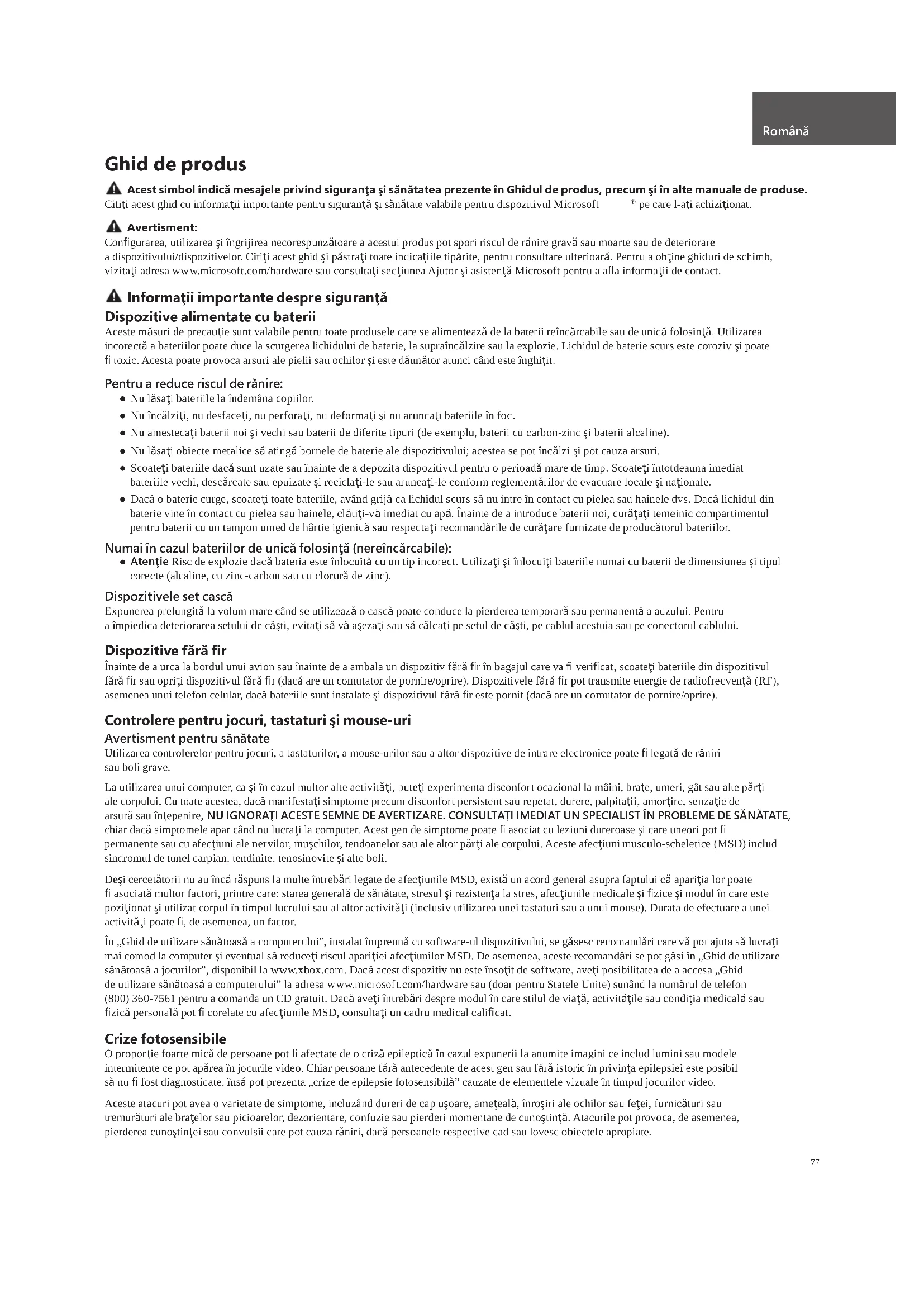 pe care l-aţi achiziţionat. Avertisment: Confi gurarea, utilizarea şi îngrijirea necorespunzătoare a acestui produs pot spori riscul de rănire gravă sau moarte sau de deteriorare a dispozitivului/dispozitivelor. Citiţi acest ghid şi păstraţi toate indicaţiile tipărite, pentru consultare ulterioară. Pentru a obţine ghiduri de schimb, vizitaţi adresa www.microsoft.com/hardware sau consultaţi secţiunea Ajutor şi asistenţă Microsoft pentru a afl a informaţii de contact. Informaţii importante despre siguranţă Dispozitive alimentate cu baterii Aceste măsuri de precauţie sunt valabile pentru toate produsele care se alimentează de la baterii reîncărcabile sau de unică folosinţă. Utilizarea incorectă a bateriilor poate duce la scurgerea lichidului de baterie, la supraîncălzire sau la explozie. Lichidul de baterie scurs este coroziv şi poate fi toxic. Acesta poate provoca arsuri ale pielii sau ochilor şi este dăunător atunci când este înghiţit. Pentru a reduce riscul de rănire: ● Nu lăsaţi bateriile la îndemâna copiilor. ● Nu încălziţi, nu desfaceţi, nu perforaţi, nu deformaţi şi nu aruncaţi bateriile în foc. ● Nu amestecaţi baterii noi şi vechi sau baterii de diferite tipuri (de exemplu, baterii cu carbon-zinc şi baterii alcaline). ● Nu lăsaţi obiecte metalice să atingă bornele de baterie ale dispozitivului; acestea se pot încălzi şi pot cauza arsuri. ● Scoateţi bateriile dacă sunt uzate sau înainte de a depozita dispozitivul pentru o perioadă mare de timp. Scoateţi întotdeauna imediat bateriile vechi, descărcate sau epuizate şi reciclaţi-le sau aruncaţi-le conform reglementărilor de evacuare locale şi naţionale. ● Dacă o baterie curge, scoateţi toate bateriile, având grijă ca lichidul scurs să nu intre în contact cu pielea sau hainele dvs. Dacă lichidul din baterie vine în contact cu pielea sau hainele, clătiţi-vă imediat cu apă. Înainte de a introduce baterii noi, curăţaţi temeinic compartimentul pentru baterii cu un tampon umed de hârtie igienică sau respectaţi recomandările de curăţare furnizate de producătorul bateriilor. Numai în cazul bateriilor de unică folosinţă (nereîncărcabile): ● Atenţie Risc de explozie dacă bateria este înlocuită cu un tip incorect. Utilizaţi şi înlocuiţi bateriile numai cu baterii de dimensiunea şi tipul corecte (alcaline, cu zinc-carbon sau cu clorură de zinc). Dispozitivele set cască Expunerea prelungită la volum mare când se utilizează o cască poate conduce la pierderea temporară sau permanentă a auzului. Pentru a împiedica deteriorarea setului de căşti, evitaţi să vă aşezaţi sau să călcaţi pe setul de căşti, pe cablul acestuia sau pe conectorul cablului. Dispozitive fără fi r Înainte de a urca la bordul unui avion sau înainte de a ambala un dispozitiv fără fi r în bagajul care va fi verifi cat, scoateţi bateriile din dispozitivul fără fi r sau opriţi dispozitivul fără fi r (dacă are un comutator de pornire/oprire). Dispozitivele fără fi r pot transmite energie de radiofrecvenţă (RF), asemenea unui telefon celular, dacă bateriile sunt instalate şi dispozitivul fără fi r este pornit (dacă are un comutator de pornire/oprire). Controlere pentru jocuri, tastaturi şi mouse-uri Avertisment pentru sănătate Utilizarea controlerelor pentru jocuri, a tastaturilor, a mouse-urilor sau a altor dispozitive de intrare electronice poate fi legată de răniri sau boli grave. La utilizarea unui computer, ca şi în cazul multor alte activităţi, puteţi experimenta disconfort ocazional la mâini, braţe, umeri, gât sau alte părţi ale corpului. Cu toate acestea, dacă manifestaţi simptome precum disconfort persistent sau repetat, durere, palpitaţii, amorţire, senzaţie de arsură sau înţepenire, NU IGNORAŢI ACESTE SEMNE DE AVERTIZARE. CONSULTAŢI IMEDIAT UN SPECIALIST ÎN PROBLEME DE SĂNĂTATE, chiar dacă simptomele apar când nu lucraţi la computer. Acest gen de simptome poate fi asociat cu leziuni dureroase şi care uneori pot fi permanente sau cu afecţiuni ale nervilor, muşchilor, tendoanelor sau ale altor părţi ale corpului. Aceste afecţiuni musculo-scheletice (MSD) includ sindromul de tunel carpian, tendinite, tenosinovite şi alte boli. Deşi cercetătorii nu au încă răspuns la multe întrebări legate de afecţiunile MSD, există un acord general asupra faptului că apariţia lor poate fi asociată multor factori, printre care: starea generală de sănătate, stresul şi rezistenţa la stres, afecţiunile medicale şi fi zice şi modul în care este poziţionat şi utilizat corpul în timpul lucrului sau al altor activităţi (inclusiv utilizarea unei tastaturi sau a unui mouse). Durata de efectuare a unei activităţi poate fi , de asemenea, un factor. În „Ghid de utilizare sănătoasă a computerului”, instalat împreună cu software-ul dispozitivului, se găsesc recomandări care vă pot ajuta să lucraţi mai comod la computer şi eventual să reduceţi riscul apariţiei afecţiunilor MSD. De asemenea, aceste recomandări se pot găsi în „Ghid de utilizare sănătoasă a jocurilor”, disponibil la www.xbox.com. Dacă acest dispozitiv nu este însoţit de software, aveţi posibilitatea de a accesa „Ghid de utilizare sănătoasă a computerului” la adresa www.microsoft.com/hardware sau (doar pentru Statele Unite) sunând la numărul de telefon (800) 360-7561 pentru a comanda un CD gratuit. Dacă aveţi întrebări despre modul în care stilul de viaţă, activităţile sau condiţia medicală sau fi zică personală pot fi corelate cu afecţiunile MSD, consultaţi un cadru medical califi cat. Crize fotosensibile O proporţie foarte mică de persoane pot fi afectate de o criză epileptică în cazul expunerii la anumite imagini ce includ lumini sau modele intermitente ce pot apărea în jocurile video. Chiar persoane fără antecedente de acest gen sau fără isto