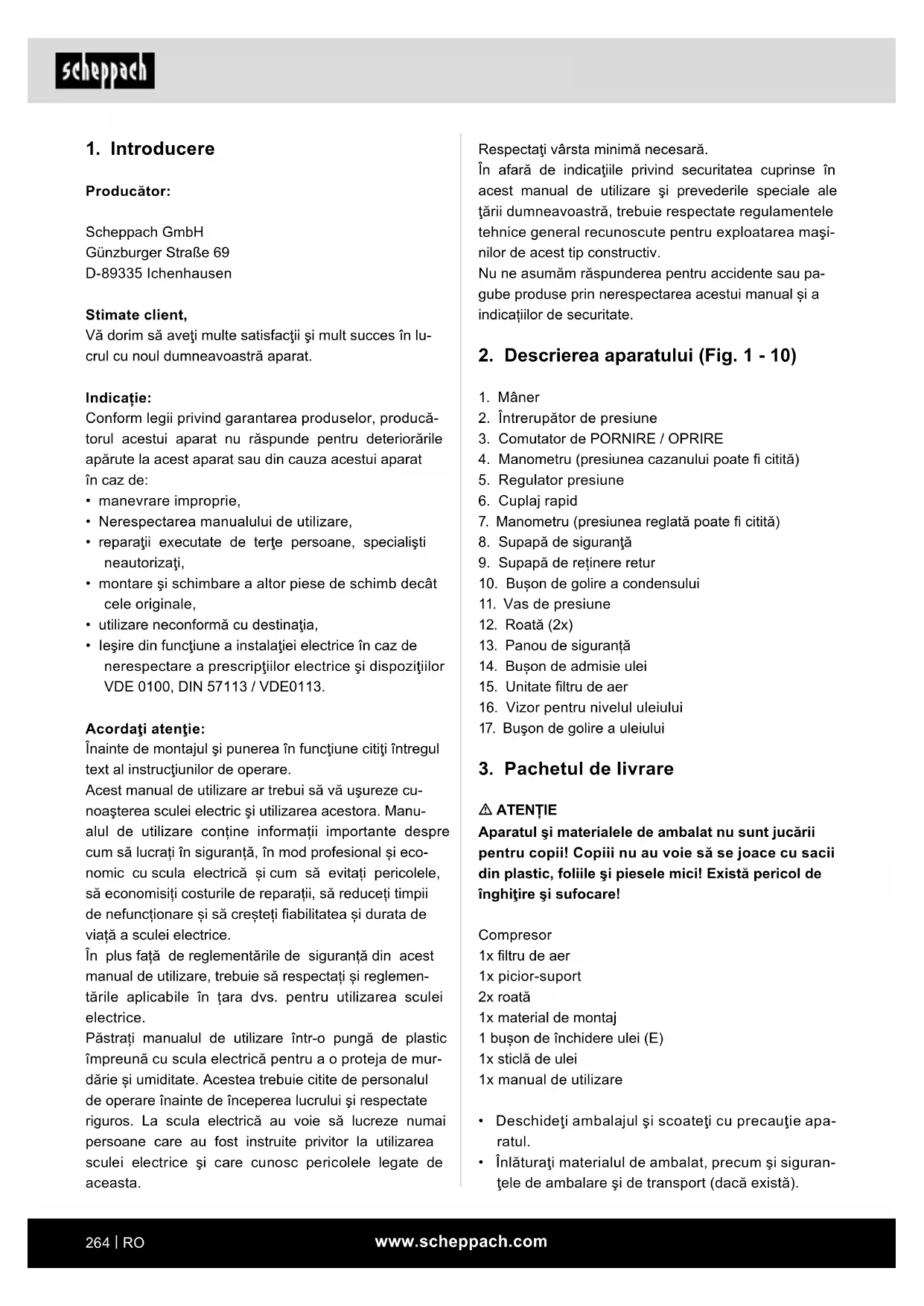 m Atenție! La folosirea sculelor electrice, se vor res- pecta următoarele măsuri principale de siguranţă şi protecţie împotriva electrocutării, vătămării corporale şi incendiului. Citiţi toate aceste indicaţii înainte de uti- lizarea acestei scule electrice şi păstraţi indicaţiile de securitate în siguranţă. m Atenție! La folosirea acestui compresor, se vor res- pecta următoarele măsuri principale de siguranţă şi protecţie împotriva electrocutării, vătămării corporale şi incendiului. Citiți și respectați aceste indicații înainte de utilizarea aparatului. Lucrul în siguranţă 1 Menţineţi în ordine zona dumneavoastră de lucru - Dezordinea în zona de lucru poate duce la acci- dente. 2 Luaţi în considerare inuenţele mediului - Nu expuneţi sculele electrice la ploaie. - Nu utilizaţi sculele electrice în medii umede sau ude. Pericol de electrocutare!www.scheppach.com