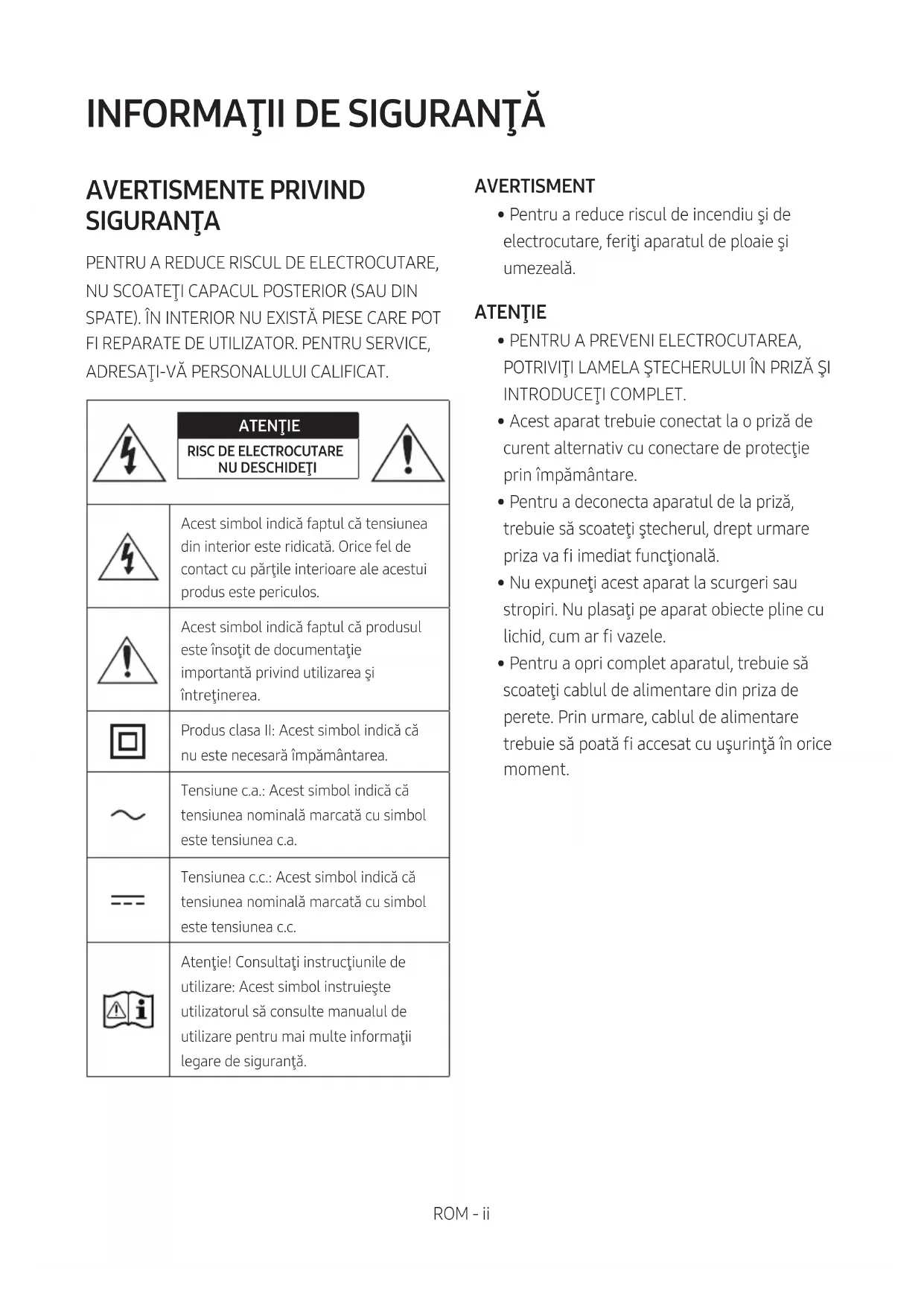 AVERTISMENTE PRIVIND SIGURANŢA PENTRU A REDUCE RISCUL DE ELECTROCUTARE, NU SCOATEŢI CAPACUL POSTERIOR (SAU DIN SPATE). ÎN INTERIOR NU EXISTĂ PIESE CARE POT FI REPARATE DE UTILIZATOR. PENTRU SERVICE, ADRESAŢI-VĂ PERSONALULUI CALIFICAT. ATENŢIE RISC DE ELECTROCUTARE NU DESCHIDEŢIAcest simbol indică faptul că tensiunea din interior este ridicată. Orice fel de contact cu părţile interioare ale acestui produs este periculos.Acest simbol indică faptul că produsul este însoţit de documentaţie importantă privind utilizarea şi întreţinerea.Produs clasa II: Acest simbol indică că nu este necesară împământarea.Tensiune c.a.: Acest simbol indică că tensiunea nominală marcată cu simbol este tensiunea c.a.Tensiunea c.c.: Acest simbol indică că tensiunea nominală marcată cu simbol este tensiunea c.c.Atenţie! Consultaţi instrucţiunile de utilizare: Acest simbol instruieşte utilizatorul să consulte manualul de utilizare pentru mai multe informaţii legare de siguranţă. AVERTISMENT