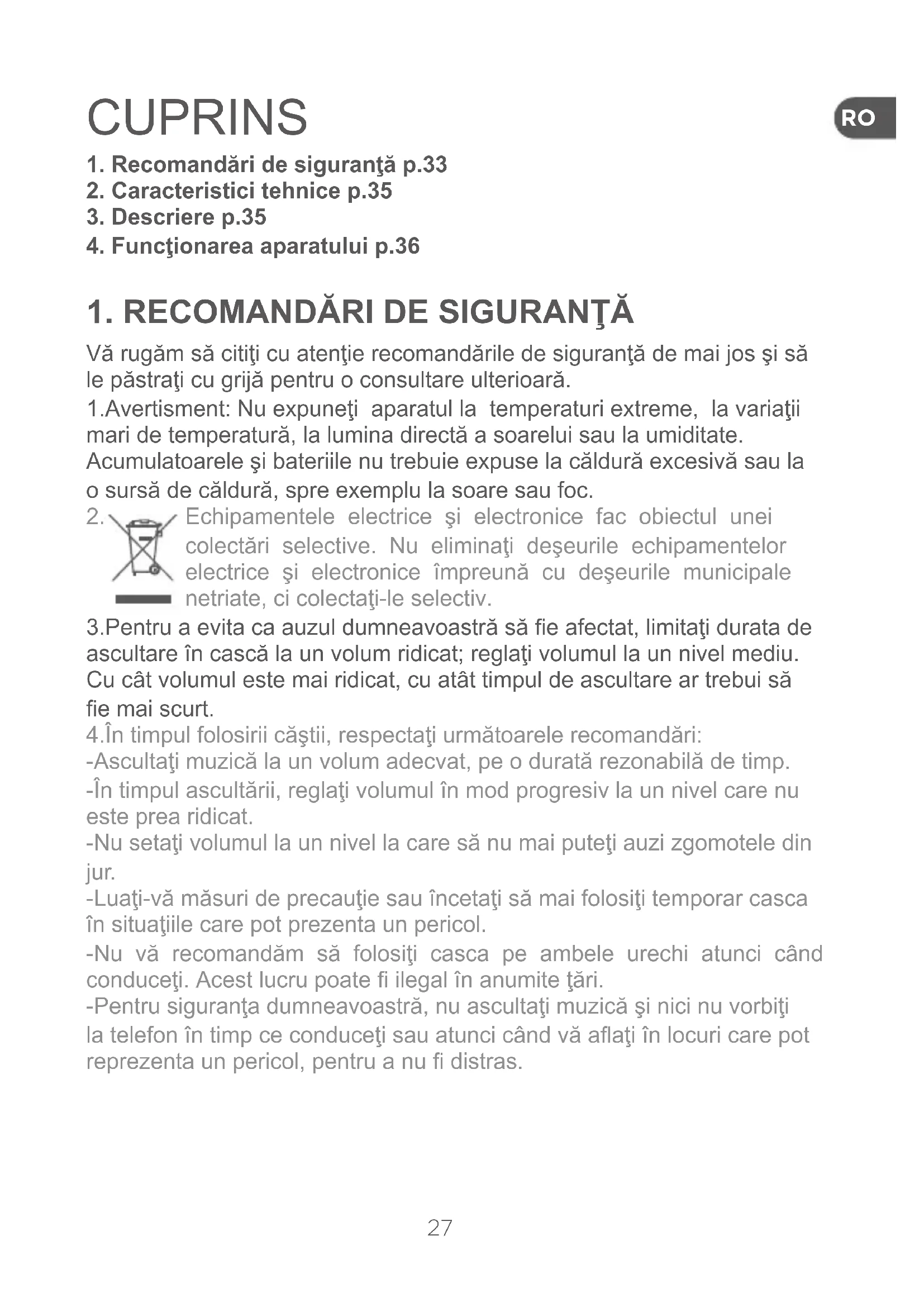 Echipamentele electrice şi electronice fac obiectul unei colectări selective. Nu eliminaţi deşeurile echipamentelor electrice şi electronice împreună cu deşeurile municipale netriate, ci colectaţi-le selectiv. 3.Pentru a evita ca auzul dumneavoastră să e afectat, limitaţi durata de ascultare în cască la un volum ridicat; reglaţi volumul la un nivel mediu. Cu cât volumul este mai ridicat, cu atât timpul de ascultare ar trebui să e mai scurt. 4.În timpul folosirii căştii, respectaţi următoarele recomandări: -Ascultaţi muzică la un volum adecvat, pe o durată rezonabilă de timp. -În timpul ascultării, reglaţi volumul în mod progresiv la un nivel care nu este prea ridicat. -Nu setaţi volumul la un nivel la care să nu mai puteţi auzi zgomotele din jur. -Luaţi-vă măsuri de precauţie sau încetaţi să mai folosiţi temporar casca în situaţiile care pot prezenta un pericol. -Nu vă recomandăm să folosiţi casca pe ambele urechi atunci când conduceţi. Acest lucru poate ilegal în anumite ţări. -Pentru siguranţa dumneavoastră, nu ascultaţi muzică şi nici nu vorbiţi la telefon în timp ce conduceţi sau atunci când vă aaţi în locuri care pot reprezenta un pericol, pentru a nu distras. RORO