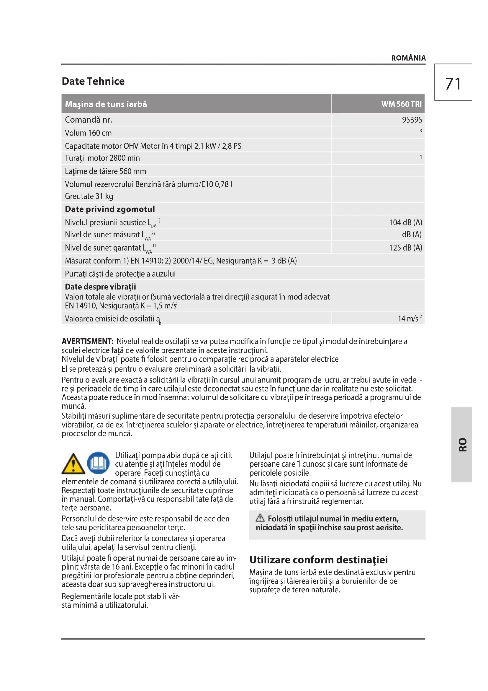 sta minimă a utilizatorului. Utilajul poate întrebuințat și întreținut numai de persoane care îl cunosc și care sunt informate de pericolele posibile. Nu lăsaţi niciodată copiii să lucreze cu acest utilaj. Nu admiteţi niciodată ca o persoană să lucreze cu acest utilaj fără a instruită reglementar. Folosiţi utilajul numai în mediu extern, niciodată în spaţii închise sau prost aerisite. Utilizare conform destinaţiei Mașina de tuns iarbă este destinată exclusiv pentru îngrijirea și tăierea ierbii și a buruienilor de pe suprafețe de teren naturale. ROMÂNIA72