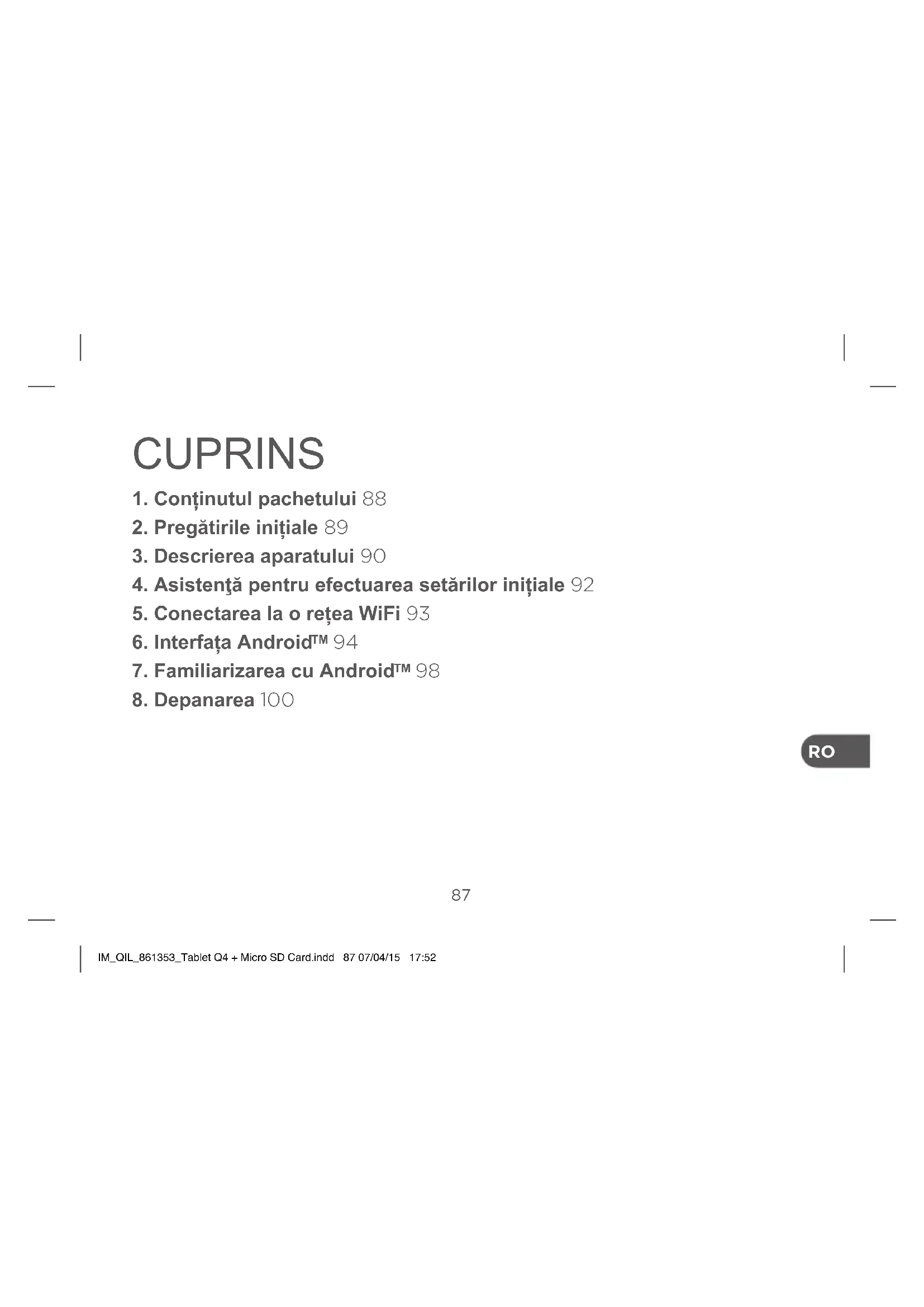 - Dacă rețeaua WiFi este deja activată şi dacă vă aați în raza de acoperire a unei rețele la care v-ați conectat deja, tableta va încerca să stabilească o conexiune în mod automat. IM_QIL_861353_Tablet Q4 + Micro SD Card.indd 93 07/04/15 17:5294