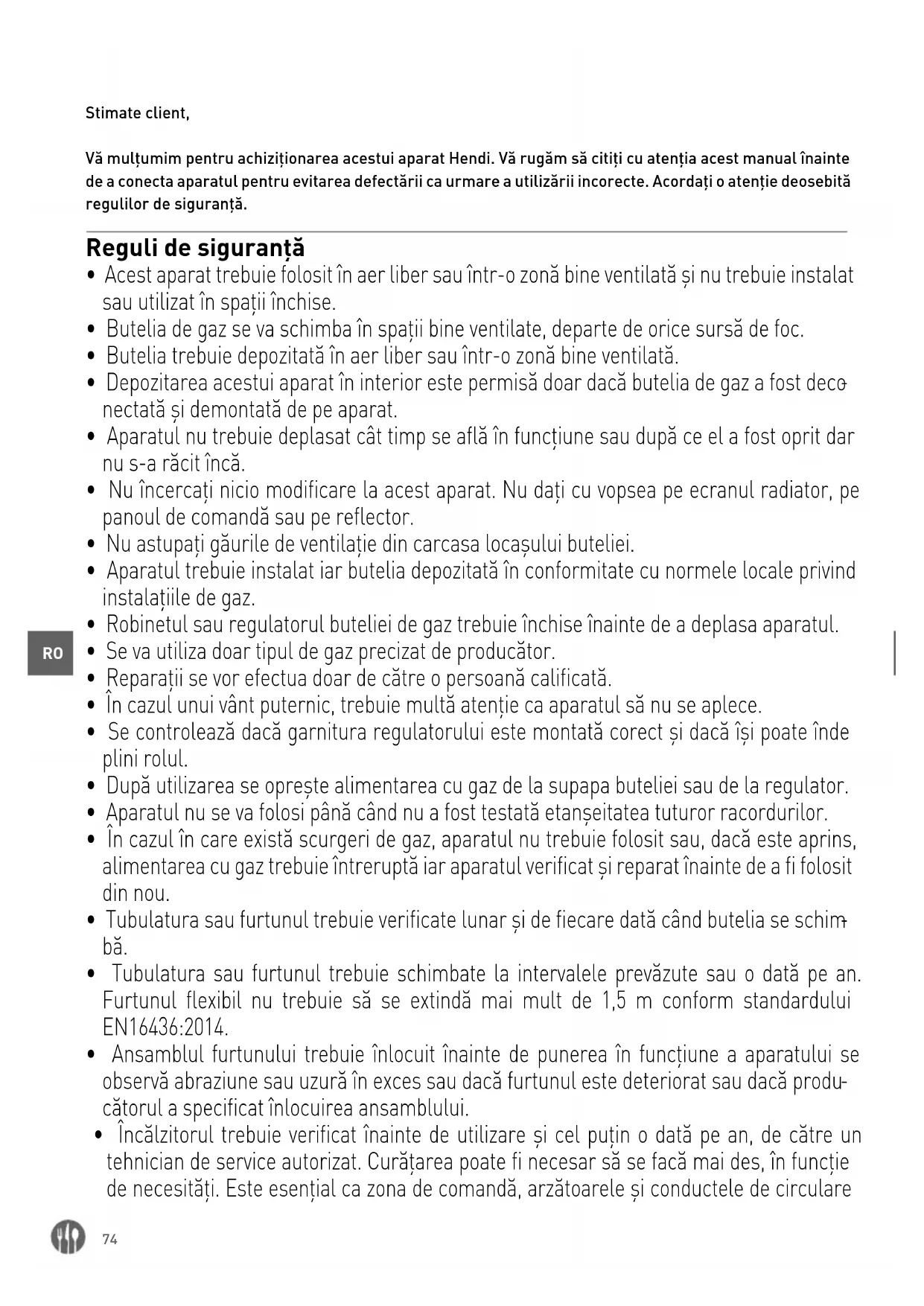 - În cazul în care există scurgeri de gaz, aparatul nu trebuie folosit sau, dacă este aprins, alimentarea cu gaz trebuie întreruptă iar aparatul verificat și reparat înainte de a fi folosit din nou.