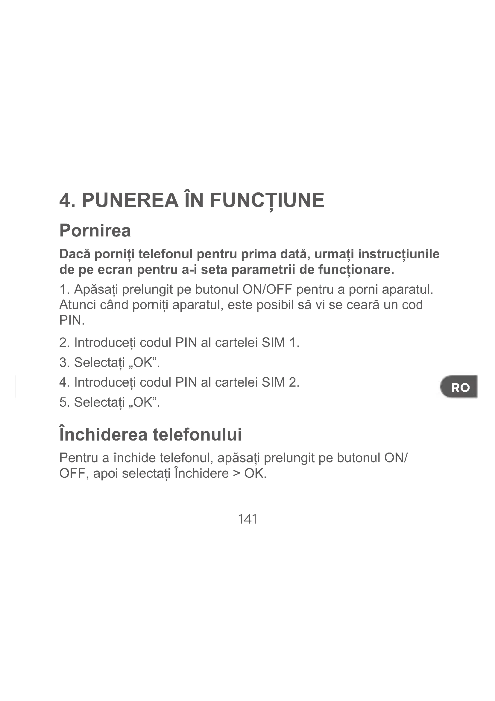 Închiderea telefonului Pentru a închide telefonul, apăsați prelungit pe butonul ON/ OFF, apoi selectați Închidere > OK.142