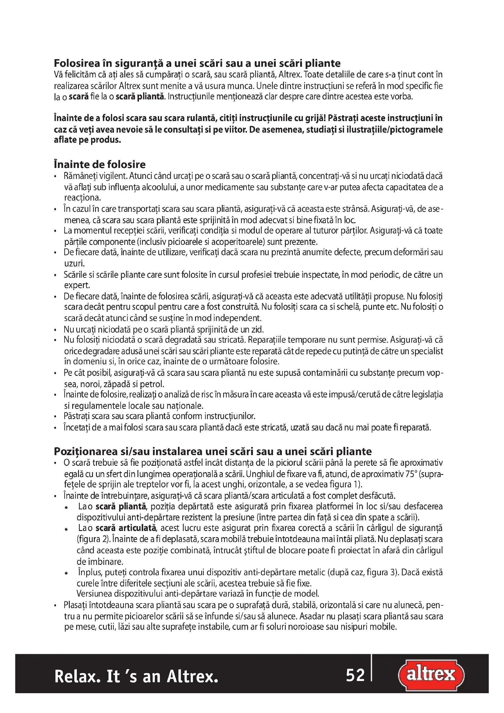 Relax. It ’s an Altrex. ETFolosirea în siguranţă a unei scări sau a unei scări pliante Vă felicităm că aţi ales să cumpăraţi o scară, sau scară pliantă, Altrex. Toate detaliile de care s-a ţinut cont în realizarea scărilor Altrex sunt menite a vă usura munca. Unele dintre instrucţiuni se referă în mod specific fie la o scară fie la o scară pliantă. Instrucţiunile menţionează clar despre care dintre acestea este vorba. Înainte de a folosi scara sau scara rulantă, citiţi instrucţiunile cu grijă! Păstraţi aceste instrucţiuni în caz că veţi avea nevoie să le consultaţi si pe viitor. De asemenea, studiaţi si ilustraţiile/pictogramele aflate pe produs. Înainte de folosire