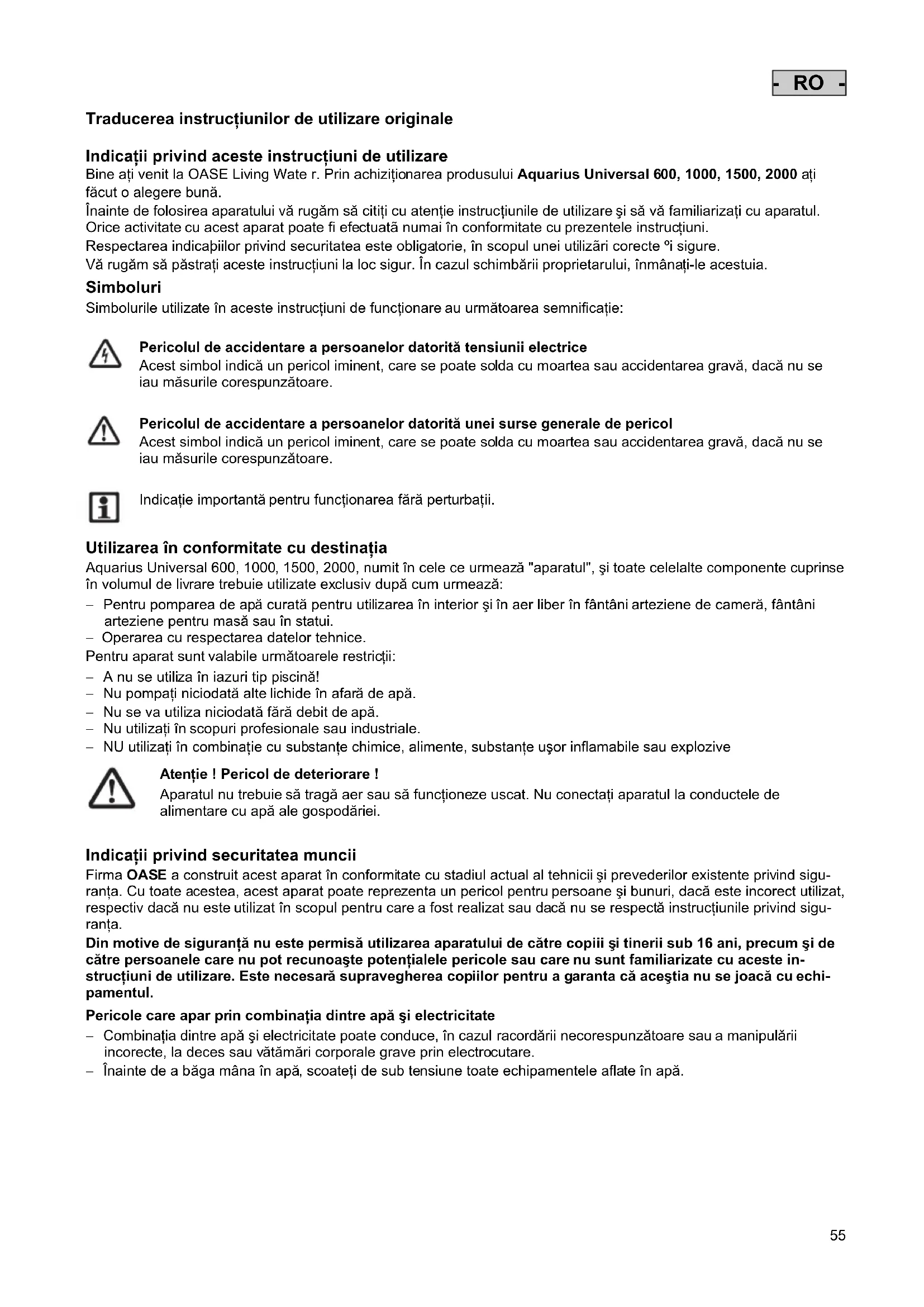 estu zaštićenom od smrzavanja. Utikač ne smije biti potopljen! Popravak Oštećeno se kućište ne može popraviti te se stoga više ne smije koristiti. Propisno zbrinite uređaj.55 - RO - Traducerea instrucţiunilor de utilizare originale Indicaţii privind aceste instrucţiuni de utilizare Bine aţi venit la OASE Living Wate r. Prin achiziţionarea produsului Aquarius Universal 600, 1000, 1500, 2000 aţi făcut o alegere bună. Înainte de folosirea aparatului vă rugăm să citiţi cu atenţie instrucţiunile de utilizare şi să vă familiarizaţi cu aparatul. Orice activitate cu acest aparat poate fi efectuatã numai în conformitate cu prezentele instrucţiuni. Respectarea indicaþiilor privind securitatea este obligatorie, în scopul unei utilizãri corecte ºi sigure. Vă rugăm să păstraţi aceste instrucţiuni la loc sigur. În cazul schimbării proprietarului, înmânaţi-le acestuia. Simboluri Simbolurile utilizate în aceste instrucţiuni de funcţionare au următoarea semnificaţie: