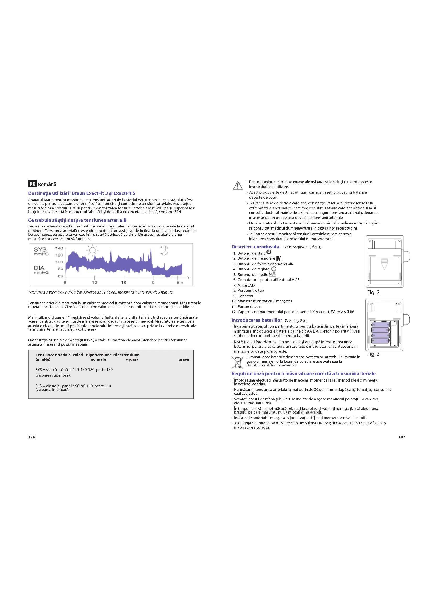 Română Destinaţia utilizării Braun ExactFit 3 şi ExactFit 5 Aparatul Braun pentru monitorizarea tensiunii arteriale la nivelul pării superioare a braului a fost dezvoltat pentru efectuarea unor măsurători precise și comode ale tensiunii arteriale. Acurateea măsurătorilor aparatului Braun pentru monitorizarea tensiunii arteriale la nivelul pării superioare a braului a fost testată în momentul fabricării și dovedită de cercetarea clinică, conform ESH. Ce trebuie să ştiţi despre tensiunea arterială Tensiunea arterială se schimbă continuu de-a lungul zilei. Ea crește brusc în zori și scade la sfârșitul dimineii. Tensiunea arterială crește din nou după-amiază și scade în nal la un nivel redus, noaptea. De asemenea, ea poate să varieze într-o scurtă perioadă de timp. De aceea, rezultatele unor măsurători succesive pot să uctueze. Tensiunea arterială a unui bărbat sănătos de 31 de ani, măsurată la intervale de 5 minute Tensiunea arterială măsurată la un cabinet medical furnizează doar valoarea momentană. Măsurătorile repetate realizate acasă reectă mai bine valorile reale ale tensiunii arteriale în condiiile cotidiene. Mai mult, muli oameni înregistrează valori diferite ale tensiunii arteriale când acestea sunt măsurate acasă, pentru că au tendina de a mai relaxai decât în cabinetul medical. Măsurători ale tensiunii arteriale efectuate acasă pot furniza doctorului informaii preioase cu privire la valorile normale ale tensiunii arteriale în condiii «cotidiene». Organizaia Mondială a Sănătăii (OMS) a stabilit următoarele valori standard pentru tensiunea arterială măsurând pulsul în repaus. Tensiunea arterială Valori Hipertensiune Hipertensiune (mmHg) normale uşoară gravă SYS = sistolă până la 140 140-180 peste 180 (valoarea superioară) DIA = diastolă până la 90 90-110 peste 110 (valoarea inferioară)