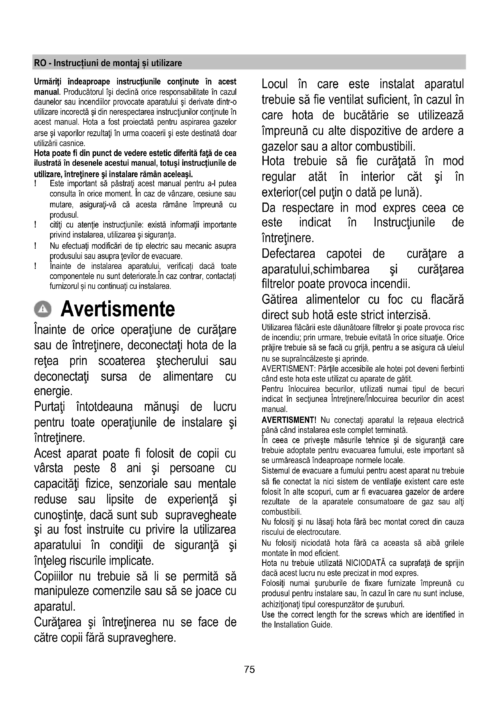 Филтърът с активен въглен се запушва приблизително след дълъг период на използване в зависимост от начина на готвене и от това колко често почиствате филтъра . Във всеки случай е необходимо да подменяте филтъра с активен въглен на всеки четири месеца или когато индикаторът за засищане на филтрите показва, че е необходимо. Не се мие нито може да се използва повторно. Подмяна на ел. крушки Изключете уреда от ел. мрежата. Внимание! Преди да вземете в ръка ел. крушките проверете дали са изстинали. Подменете повредената лампа с нова от същия тип, така както е посочено върху етикета с характеристиките или близо до самата лампа върху аспиратора. За да подмените лампите на квадратните светодиоди, натиснете рамката на светодиода, там където пише “PUSH”, след което подменете ел. крушката и затворете рамката чрез прищракване. Използвайте само халогенни лампи от 12V, максимум 20W - G4, като внимавате да не ги докосвате с ръка. Ако ел. крушките не светят, проверете дали са монтирани правилно преди да потърсите помощта на специалист.75 RO - Instrucțiuni de montaj și utilizare Urmăriţi îndeaproape instrucţiunile conţinute în acest manual. Producătorul îşi declină orice responsabilitate în cazul daunelor sau incendiilor provocate aparatului şi derivate dintr-o utilizare incorectă şi din nerespectarea instrucţiunilor conţinute în acest manual. Hota a fost proiectată pentru aspirarea gazelor arse şi vaporilor rezultaţi în urma coacerii şi este destinată doar utilizării casnice. Hota poate fi din punct de vedere estetic diferită faţă de cea ilustrată în desenele acestui manual, totuşi instrucţiunile de utilizare, întreţinere şi instalare rămân aceleaşi. ! Este important să păstraţi acest manual pentru a-l putea consulta în orice moment. În caz de vânzare, cesiune sau mutare, asiguraţi-vă că acesta rămâne împreună cu produsul. ! citiţi cu atenţie instrucţiunile: există informaţii importante privind instalarea, utilizarea şi siguran ţa. ! Nu efectuaţi modificări de tip electric sau mecanic asupra produsului sau asupra ţevilor de evacuare. ! Înainte de instalarea aparatului, verificați dacă toate componentele nu sunt deteriorate.În caz contrar, contactați furnizorul și nu continuați cu instalarea. Avertismente Înainte de orice operaţiune de curăţare sau de întreţinere, deconectaţi hota de la reţea prin scoaterea ştecherului sau deconectaţi sursa de alimentare cu energie. Purtaţi întotdeauna mănuşi de lucru pentru toate operaţiunile de instalare şi întreţinere. Acest aparat poate fi folosit de copii cu vârsta peste 8 ani şi persoane cu capacităţi fizice, senzoriale sau mentale reduse sau lipsite de experienţă şi cunoştinţe, dacă sunt sub supravegheate şi au fost instruite cu privire la utilizarea aparatului în condiţii de siguranţă şi înţeleg riscurile implicate. Copiiilor nu trebuie să li se permită să manipuleze comenzile sau să se joace cu aparatul. Curăţarea şi întreţinerea nu se face de către copii fără supraveghere. Locul în care este instalat aparatul trebuie să fie ventilat suficient, în cazul în care hota de bucătărie se utilizează împreună cu alte dispozitive de ardere a gazelor sau a altor combustibili. Hota trebuie să fie curăţată în mod regular atăt în interior căt şi în exterior(cel puţin o dată pe lună). Da respectare in mod expres ceea ce este indicat în Instrucţiunile de întreţinere. Defectarea capotei de curăţare a aparatului,schimbarea şi curăţarea filtrelor poate provoca incendii. Gătirea alimentelor cu foc cu flacără direct sub hotă este strict interzisă. Utilizarea flăcării este dăunătoare filtrelor şi poate provoca risc de incendiu; prin urmare, trebuie evitată în orice situaţie. Orice prăjire trebuie să se facă cu grijă, pentru a se asigura că uleiul nu se supraîncălzeste şi aprinde. AVERTISMENT: Părţile accesibile ale hotei pot deveni fierbinti când este hota este utilizat cu aparate de gătit. Pentru înlocuirea becurilor, utilizati numai tipul de becuri indicat în secţiunea Întreţinere/Înlocuirea becurilor din acest manual. AVERTISMENT! Nu conectaţi aparatul la reţeaua electrică până când instalarea este complet terminată. În ceea ce priveşte măsurile tehnice şi de siguranţă care trebuie adoptate pentru evacuarea fumului, este important să se urmărească îndeaproape normele locale. Sistemul de evacuare a fumului pentru acest aparat nu trebuie să fie conectat la nici sistem de ventilaţie existent care este folosit în alte scopuri, cum ar fi evacuarea gazelor de ardere rezultate de la aparatele consumatoare de gaz sau alţi combustibili. Nu folosiţi şi nu lăsaţi hota fără bec montat corect din cauza riscului de electrocutare. Nu folosiţi niciodată hota fără ca aceasta să aibă grilele montate în mod eficient. Hota nu trebuie utilizată NICIODATĂ ca suprafaţă de sprijin dacă acest lucru nu este precizat in mod expres. Folosiţi numai şuruburile de fixare furnizate împreună cu produsul pentru instalare sau, în cazul în care nu sunt incluse, achiziţiona
