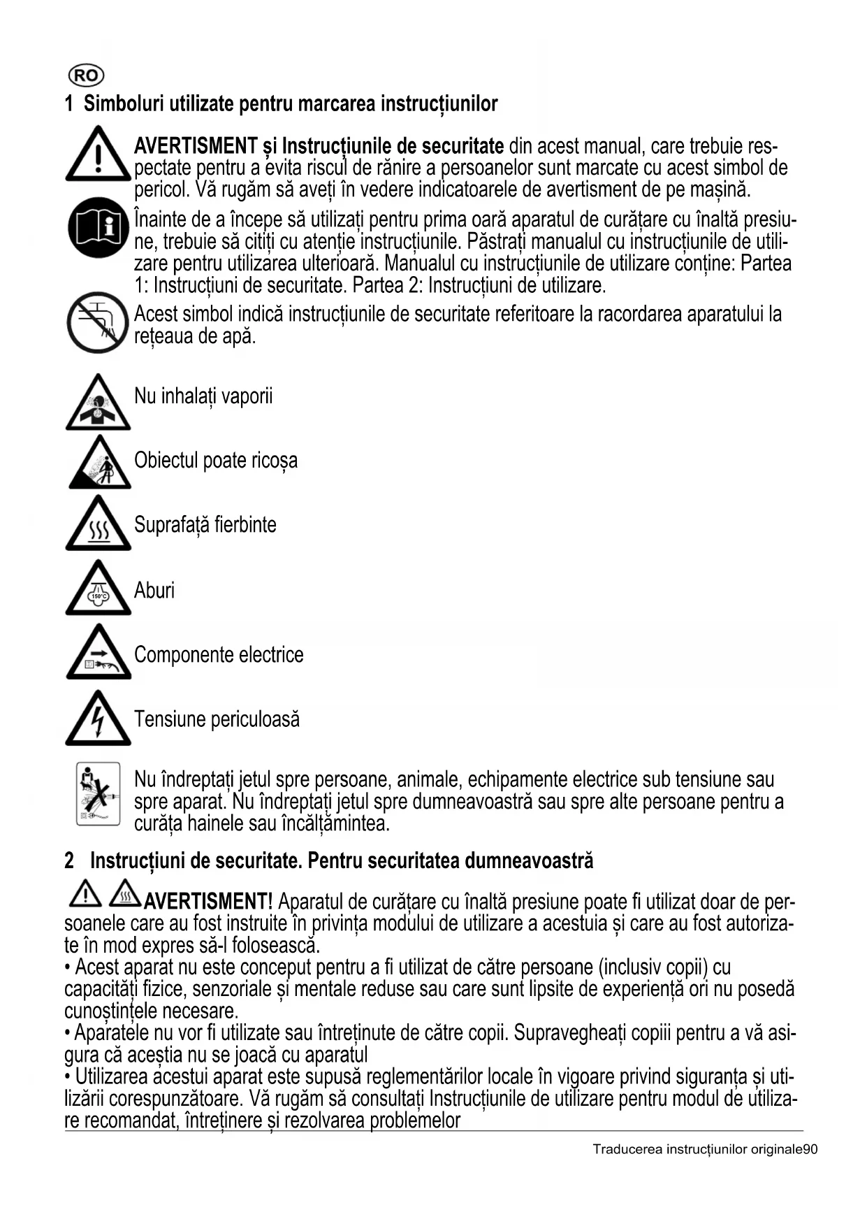 - Ha a tápkábel sérült, akkor a veszélyek megelőzése érdekében a gyártó, a márkaszerviz vagy egy kellően képzett szakember cserélje azt ki.Traducerea instrucțiunilor originale90 1 Simboluri utilizate pentru marcarea instrucțiunilor AVERTISMENT și Instrucțiunile de securitate din acest manual, care trebuie res- pectate pentru a evita riscul de rănire a persoanelor sunt marcate cu acest simbol de pericol. Vă rugăm să aveți în vedere indicatoarele de avertisment de pe mașină. Înainte de a începe să utilizați pentru prima oară aparatul de curățare cu înaltă presiu- ne, trebuie să citiți cu atenție instrucțiunile. Păstrați manualul cu instrucțiunile de utili- zare pentru utilizarea ulterioară. Manualul cu instrucțiunile de utilizare conține: Partea 1: Instrucțiuni de securitate. Partea 2: Instrucțiuni de utilizare. Acest simbol indică instrucțiunile de securitate referitoare la racordarea aparatului la rețeaua de apă. Nu inhalați vaporii Obiectul poate ricoșa Suprafață fierbinte Aburi Componente electrice Tensiune periculoasă Nu îndreptați jetul spre persoane, animale, echipamente electrice sub tensiune sau spre aparat. Nu îndreptați jetul spre dumneavoastră sau spre alte persoane pentru a curăța hainele sau încălțămintea. 2 Instrucțiuni de securitate. Pentru securitatea dumneavoastră AVERTISMENT! Aparatul de curățare cu înaltă presiune poate fi utilizat doar de per- soanele care au fost instruite în privința modului de utilizare a acestuia și care au fost autoriza- te în mod expres să-l folosească.