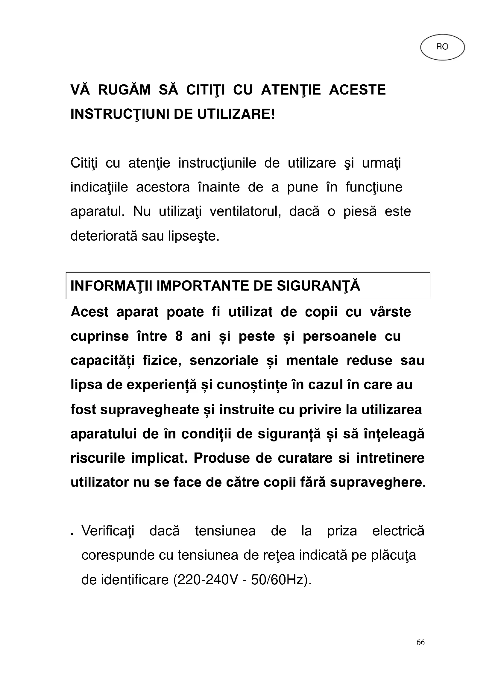 Acest aparat poate fi utilizat de copii cu vârste cuprinse între 8 ani și peste și persoanele cu capacități fizice, senzoriale și mentale reduse sau lipsa de experiență și cunoștințe în cazul în care au fost supravegheate și instruite cu privire la utilizarea aparatului de în condiții de siguranță și să înțeleagă riscurile implicat. Produse de curatare si intretinere utilizator nu se face de către copii fără supraveghere. Verificaţi dacă tensiunea de la priza electrică corespunde cu tensiunea de reţea indicată pe plăcuţa de identificare (220-240V - 50/60Hz). RO67 Nu este permisă acoperirea cablului electric. Conectaţi aparatul în aşa fel, încât nimeni să nu se poată împiedica de cablul electric. Asiguraţi-vă că dispozitivul în timp ce operează pe o suprafaţă solidă, nivel. Scoateţi ştecherul din priză, dacă nu utilizaţi aparatul. Pentru aceasta, nu trageţi de cablu, ci de ştecher. Asiguraţi-vă că în apropierea ventilatorului nu se găsesc obiecte ce ar putea perturba oscilarea acestuia. Nu pune un deget, creion sau alte elemente prin reţeaua, în timp ce unitatea este în funcţiune. Asiguraţi-vă că în apropierea aparatului nu se găsesc perdele, feţe de masă, obiecte de îmbrăcăminte, draperii, părul şi altele similare acestora. Acestea pot fi absorbite prin orificiul ventilatorului ceea ce ar putea produce deteriorări sau vătămări. Luaţi unitatea în funcţiune, în cazul în care cablul sau fisa este deteriorat sau nu funcţionează corect sau a fost deteriorat în vreun fel. Verificaţi cablul de alimentare înainte de fiecare utilizare pentru crăpături sau alte semne de uzură şi68 l-au inspectat unitatea şi, dacă este necesar, înlocuiţi cablul de alimentare. Va rugam sa consultati un expert sau un reprezentant autorizat în mod corespunzător. Aparatul este adecvat numai pentru utilizarea în spaţii închise Aparatul, ştecherul sau cablul nu trebuie să ajungă în contact cu apa sau vaporii de apă sau să fie stropite cu lichid. Nu utilizaţi aparatul în apropierea băii, duşului, a unei piscine sau într-o spălătorie Evitaţi expunerea aparatului la razele directe ale soarelui sau utilizarea acestuia în apropierea unei ferestre. Nu utilizaţi aparatul împreună cu celălalt regulator de turaţie cu semiconductor (de exemplu reostat). În timpul funcţionării, ventilatorul trebuie să stea în poziţie verticală şi nu trebuie în nici un caz să fie culcat pe o parte. Luaţi aparatul în imediata apropiere a gazelor explozive sau inflamabile în funcţiune Scoateţi ştecherul din priză atunci când nu utilizaţi aparatul sau când locul ventilatorul într-un alt loc, sau să elimine componente sau să stabilească dacă doriţi69 să curăţaţi aparatul. Nu încercați niciodată să vă reparați dispozitivul singur. În cazul în care o reparație este necesar, vă rugăm să ne contactați la piata.