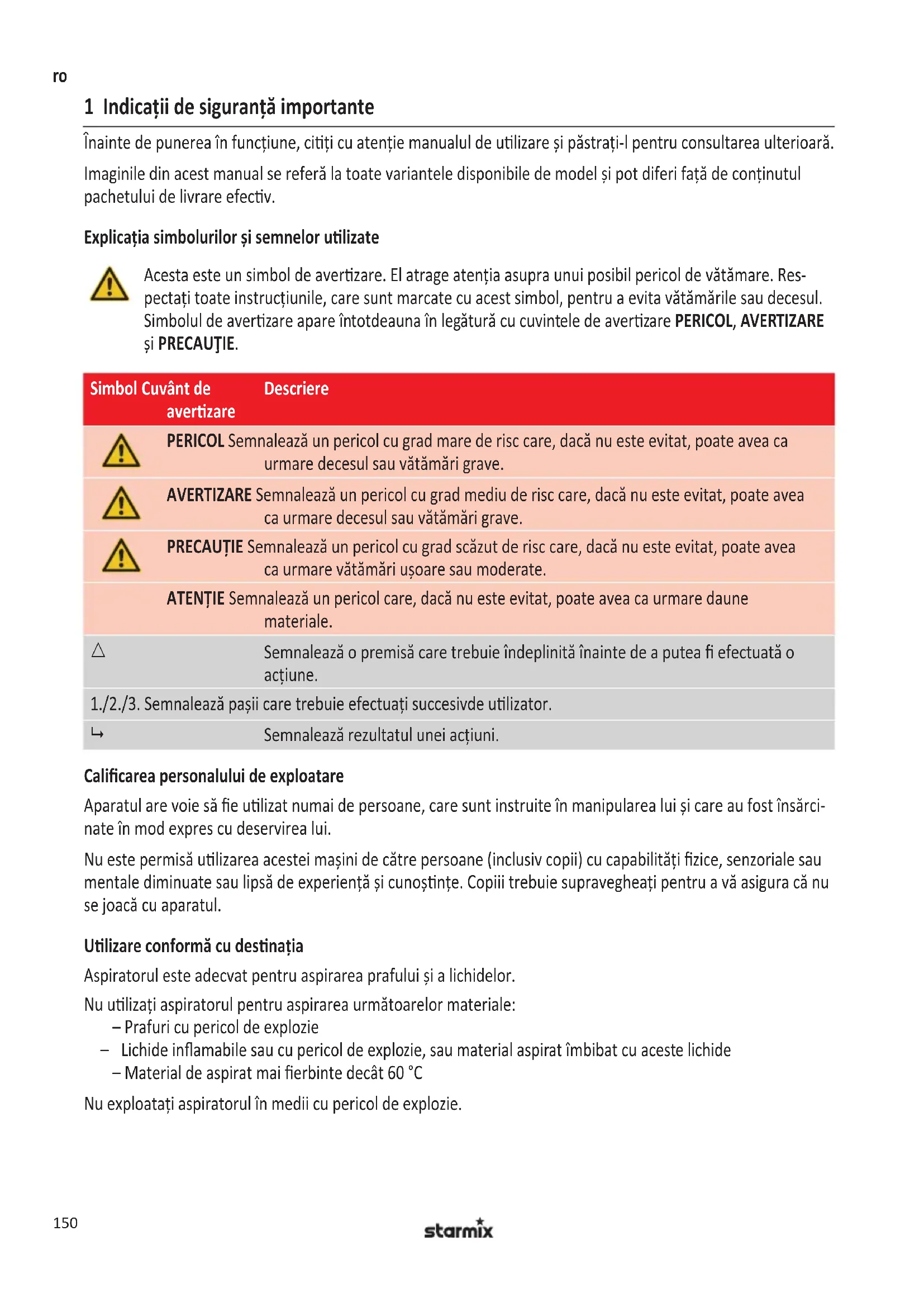In timpul intreineri si curatai aspiratorului, procedati astfel incat sa nu rezulte niciun pericol pentru personalul de intreinere si alte personane.
