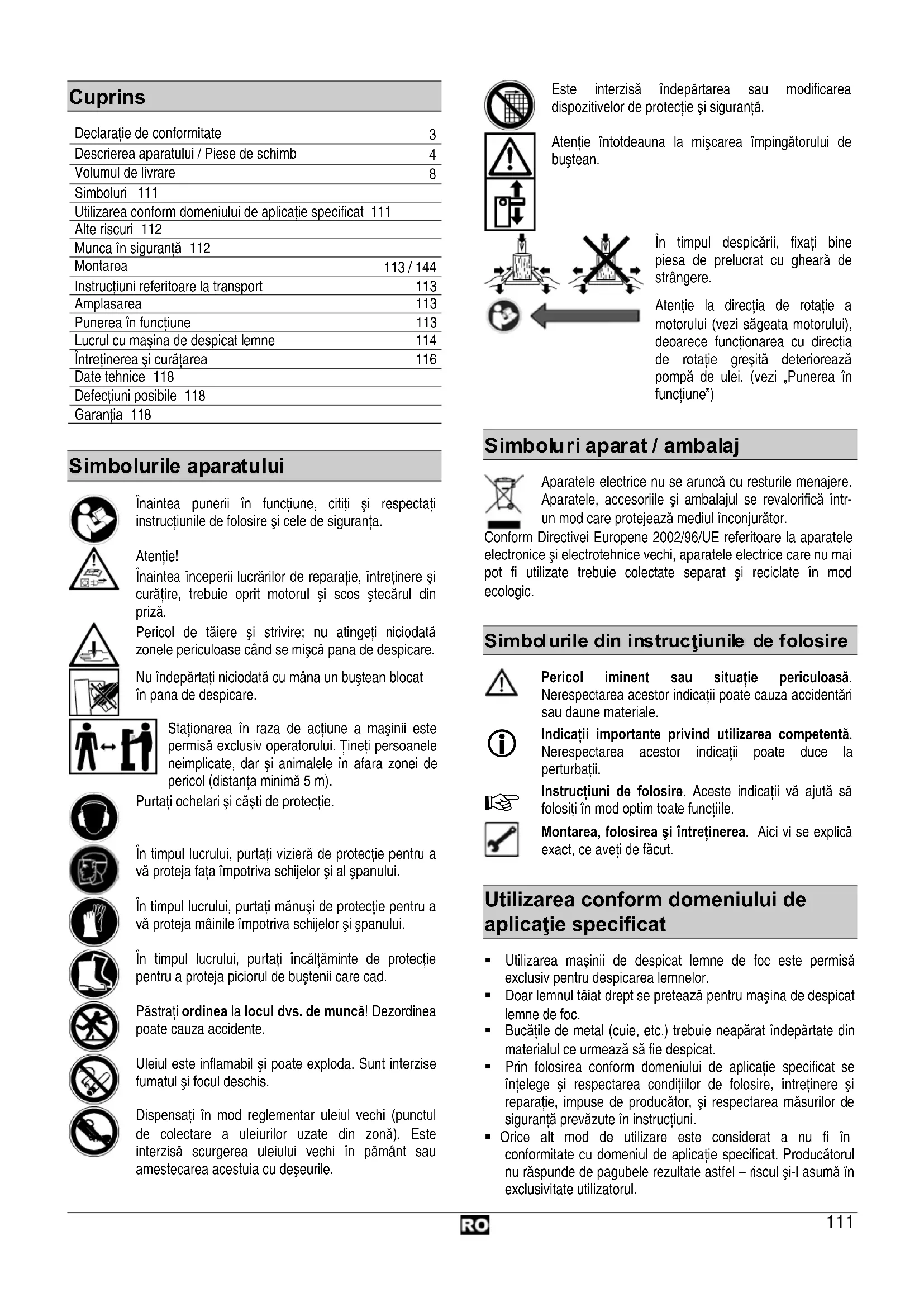 Declaraţie de conformitate Descrierea aparatului / Piese de schimb Volumul de livrare Simboluri 111Utilizarea conform domeniului de aplicaţie specificat 111Alte riscuri 112Munca în siguranţă 112Montarea 113 / 144 Instrucţiuni referitoare la transport 113 Amplasarea 113Punerea în funcţiune 113 Lucrul cu maşina de despicat lemne 114 Întreţinerea şi curăţarea 116 Date tehnice 118Defecţiuni posibile 118Garanţia 118