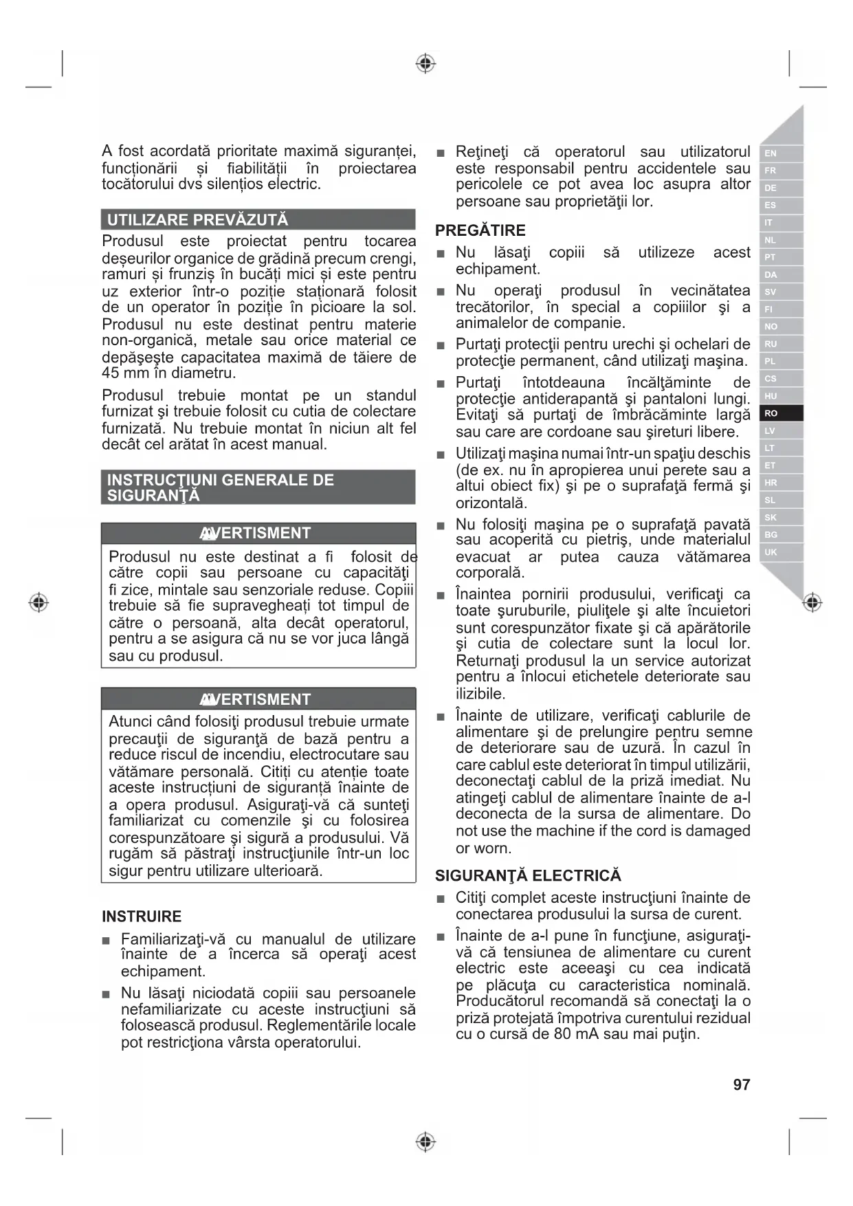 SIGURANŢĂ AVERTISMENT Produsul nu este destinat a fi folosit de către copii sau persoane cu capacităţi fi zice, mintale sau senzoriale reduse. Copiii trebuie să fi e supravegheați tot timpul de către o persoană, alta decât operatorul, pentru a se asigura că nu se vor juca lângă sau cu produsul. AVERTISMENT Atunci când folosiţi produsul trebuie urmate precauţii de siguranţă de bază pentru a reduce riscul de incendiu, electrocutare sau vătămare personală. Citiți cu atenție toate aceste instrucțiuni de siguranță înainte de a opera produsul. Asiguraţi-vă că sunteţi familiarizat cu comenzile şi cu folosirea corespunzătoare şi sigură a produsului. Vă rugăm să păstraţi instrucţiunile într-un loc sigur pentru utilizare ulterioară. INSTRUIRE ■ Familiarizaţi-vă cu manualul de utilizare înainte de a încerca să operaţi acest echipament. ■ Nu lăsaţi niciodată copiii sau persoanele nefamiliarizate cu aceste instrucţiuni să folosească produsul. Reglementările locale pot restricţiona vârsta operatorului. ■ Reţineţi că operatorul sau utilizatorul este responsabil pentru accidentele sau pericolele ce pot avea loc asupra altor persoane sau proprietăţii lor. PREGĂTIRE ■ Nu lăsaţi copiii să utilizeze acest echipament. ■ Nu operaţi produsul în vecinătatea trecătorilor, în special a copiiilor şi a animalelor de companie. ■ Purtaţi protecţii pentru urechi şi ochelari de protecţie permanent, când utilizaţi maşina. ■ Purtaţi întotdeauna încălţăminte de protecţie antiderapantă şi pantaloni lungi. Evitaţi să purtaţi de îmbrăcăminte largă sau care are cordoane sau şireturi libere. ■ Utilizaţi maşina numai într-un spaţiu deschis (de ex. nu în apropierea unui perete sau a altui obiect fix) şi pe o suprafaţă fermă şi orizontală. ■ Nu folosiţi maşina pe o suprafaţă pavată sau acoperită cu pietriş, unde materialul evacuat ar putea cauza vătămarea corporală. ■ Înaintea pornirii produsului, verificaţi ca toate şuruburile, piuliţele şi alte încuietori sunt corespunzător fixate şi că apărătorile şi cutia de colectare sunt la locul lor. Returnaţi produsul la un service autorizat pentru a înlocui etichetele deteriorate sau ilizibile. ■ Înainte de utilizare, verificaţi cablurile de alimentare şi de prelungire pentru semne de deteriorare sau de uzură. În cazul în care cablul este deteriorat în timpul utilizării, deconectaţi cablul de la priză imediat. Nu atingeţi cablul de alimentare înainte de a-l deconecta de la sursa de alimentare. Do not use the machine if the cord is damaged or worn. SIGURANŢĂ ELECTRICĂ ■ Citiţi complet aceste instrucţiuni înainte de conectarea produsului la sursa de curent. ■ Înainte de a-l pune în funcţiune, asiguraţi- vă că tensiunea de alimentare cu curent electric este aceeaşi cu cea indicată pe plăcuţa cu caracteristica nominală. Producătorul recomandă să conectaţi la o priză protejată împotriva curentului rezidual cu o cursă de 80 mA sau mai puţin.98 | Română ■ Conectarea la orice altă sursă de alimentare poate cauza deteriorarea produsului. ■ If the supply cord is damaged, it must be replaced by the manufacturer, its service agent or similarly qualified persons in order to avoid a hazard. ■ Dacă e nevoie să folosiţi un cablu prelungitor asiguraţi-vă că este corespunzător pentru uzul în exterior şi are o valoare nominală a curentului suficientă să vă alimenteze aparatul. Cablul prelungitor trebuie să fie marcat fie "H05 RN F", fie "H05 VV F". Verificaţi după fiecare folosire dacă este deteriorată, întotdeauna desfăşuraţi cablul în timpul folosirii întrucât cablul înfăşurat se poate supraîncălzi. Cablurile prelungitoare deteriorate nu trebuie reparate, ele trebuie înlocuite cu un model echivalent. ■ O supratensiune cauzează fluctuații de tensiune și poate afecta alte produse electrice pe aceeși linie de alimentare cu curent. Conectaţi produsul la sursa de curent cu o impedanţă egală cu sau mai mică de 0.404 pentru a minimaliza fluctuaţiile de tensiune. Contactați furnizorul dvs. de electricitate pentru clarificări ulterioare.