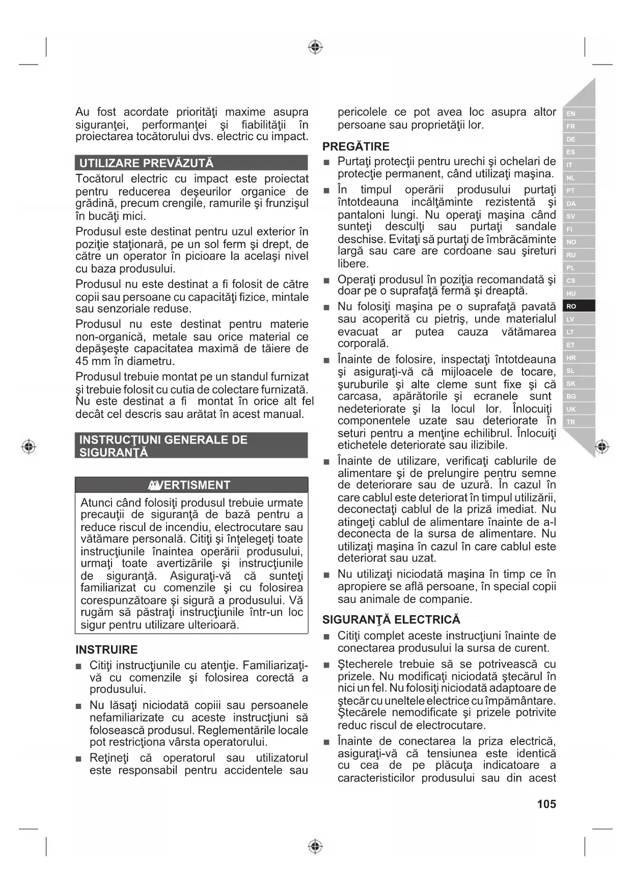 Tocătorul electric cu impact este proiectat pentru reducerea deşeurilor organice de grădină, precum crengile, ramurile şi frunzişul în bucăţi mici. Produsul este destinat pentru uzul exterior în poziţie staţionară, pe un sol ferm şi drept, de către un operator în picioare la acelaşi nivel cu baza produsului. Produsul nu este destinat a fi folosit de către copii sau persoane cu capacităţi fi zice, mintale sau senzoriale reduse. Produsul nu este destinat pentru materie non-organică, metale sau orice material ce depăşeşte capacitatea maximă de tăiere de 45 mm în diametru. Produsul trebuie montat pe un standul furnizat şi trebuie folosit cu cutia de colectare furnizată. Nu este destinat a fi montat în orice alt fel decât cel descris sau arătat în acest manual.