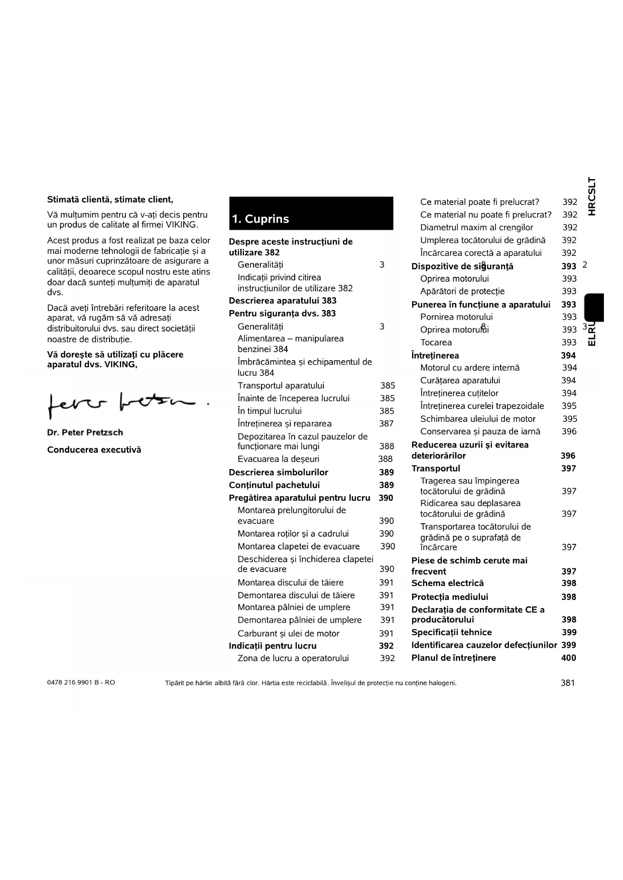 HRCSLTRO 0478 216 9901 B - RO ELRU Tipărit pe hârtie albită fără clor. Hârtia este reciclabilă. Învelişul de protecţie nu conţine halogeni. Stimată clientă, stimate client, Vă mulţumim pentru că v-aţi decis pentru un produs de calitate al firmei VIKING. Acest produs a fost realizat pe baza celor mai moderne tehnologii de fabricaţie şi a unor măsuri cuprinzătoare de asigurare a calităţii, deoarece scopul nostru este atins doar dacă sunteţi mulţumiţi de aparatul dvs. Dacă aveţi întrebări referitoare la acest aparat, vă rugăm să vă adresaţi distribuitorului dvs. sau direct societăţii noastre de distribuţie. Vă doreşte să utilizaţi cu plăcere aparatul dvs. VIKING, Conducerea executivă