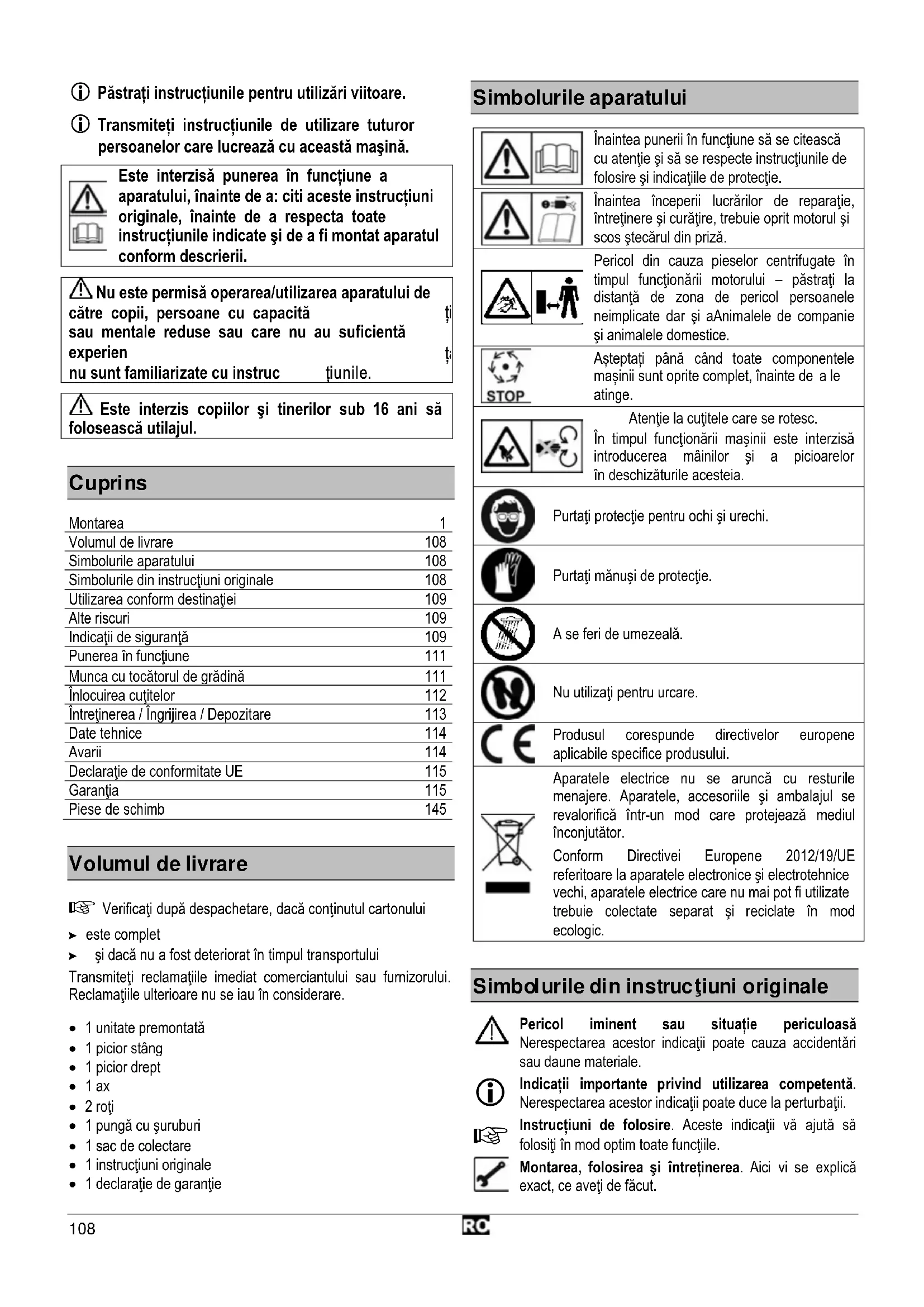 Așteptați până când toate componentele mașinii sunt oprite complet, înainte de a le atinge. Atenţie la cuţitele care se rotesc. În timpul funcţionării maşinii este interzisă introducerea mâinilor şi a picioarelor în deschizăturile acesteia. Purtaţi protecţie pentru ochi şi urechi. Purtaţi mănuşi de protecţie. A se feri de umezeală. Nu utilizaţi pentru urcare. Produsul corespunde directivelor europene aplicabile specifice produsului. Aparatele electrice nu se aruncă cu resturile menajere. Aparatele, accesoriile şi ambalajul se revalorifică într-un mod care protejează mediul înconjutător. Conform Directivei Europene 2012/19/UE referitoare la aparatele electronice şi electrotehnice vechi, aparatele electrice care nu mai pot fi utilizate trebuie colectate separat şi reciclate în mod ecologic.