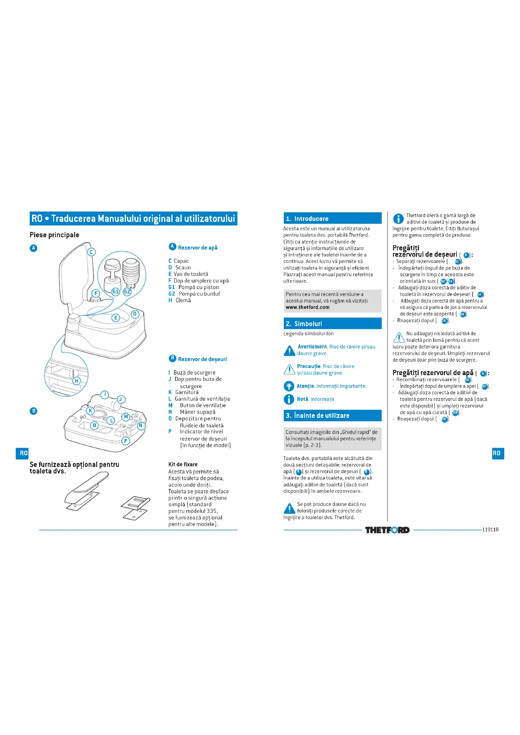 Acesta este un manual al utilizatorului pentru toaleta dvs. portabilă Thetford. Citiţi cu atenţie instrucţiunile de siguranţă și informaţiile de utilizare și întreţinere ale toaletei înainte de a continua. Acest lucru vă permite să utilizaţi toaleta în siguranţă și eficient. Păstraţi acest manual pentru referinţe ulterioare.Pentru cea mai recentă versiune a acestui manual, vă rugăm să vizitaţi www.thetford.com
