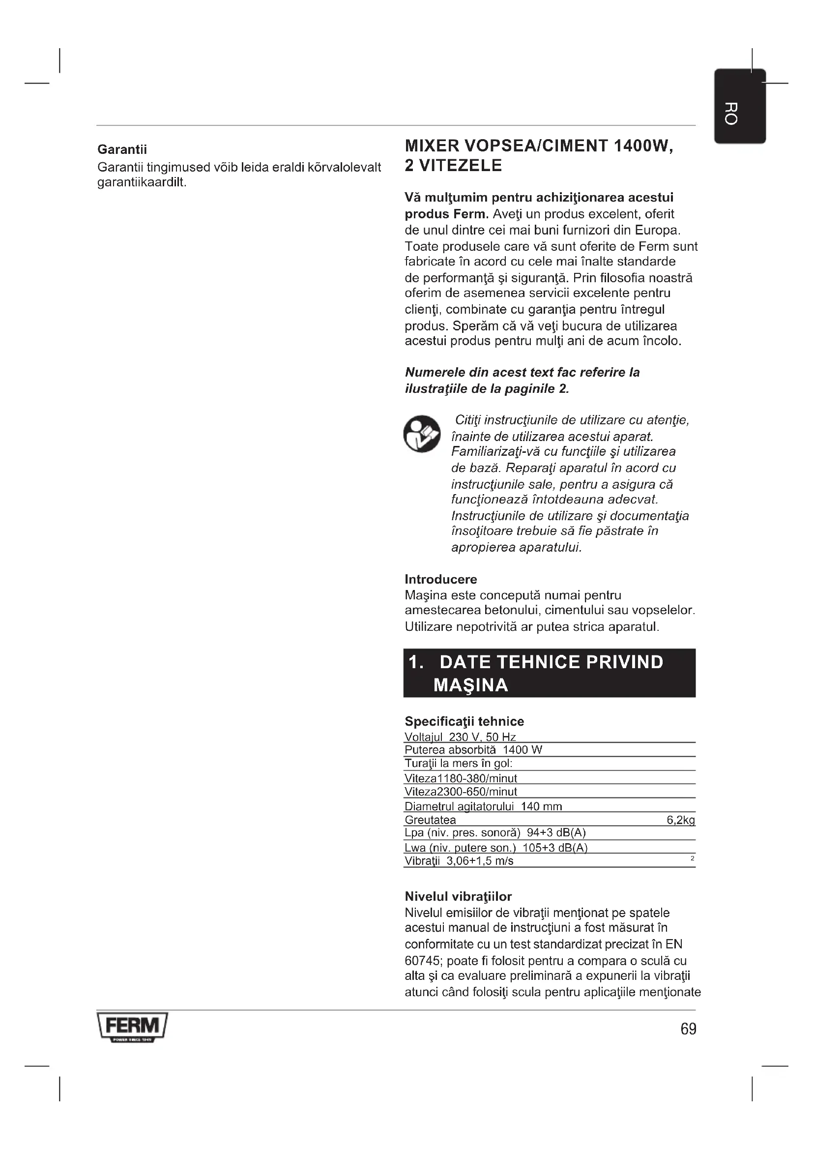Garantii Garantii tingimused võib leida eraldi kõrvalolevalt garantiikaardilt. MIXER VOPSEA/CIMENT 1400W, 2 VITEZELE Vă mulţumim pentru achiziţionarea acestui produs Ferm. Aveţi un produs excelent, oferit de unul dintre cei mai buni furnizori din Europa. Toate produsele care vă sunt oferite de Ferm sunt fabricate în acord cu cele mai înalte standarde de performanţă şi siguranţă. Prin filosofia noastră oferim de asemenea servicii excelente pentru clienţi, combinate cu garanţia pentru întregul produs. Sperăm că vă veţi bucura de utilizarea acestui produs pentru mulţi ani de acum încolo. Numerele din acest text fac referire la ilustraţiile de la paginile 2. Citiţiinstrucţiuniledeutilizarecuatenţie, înainte de utilizarea acestui aparat. Familiarizaţivăcufuncţiileşiutilizarea debază.Reparaţiaparatulînacordcu instrucţiunilesale,pentruaasiguracă funcţioneazăîntotdeaunaadecvat. Instrucţiuniledeutilizareşidocumentaţia însoţitoaretrebuiesăfiepăstrateîn apropierea aparatului. Introducere Maşina este concepută numai pentru amestecarea betonului, cimentului sau vopselelor. Utilizare nepotrivită ar putea strica aparatul.