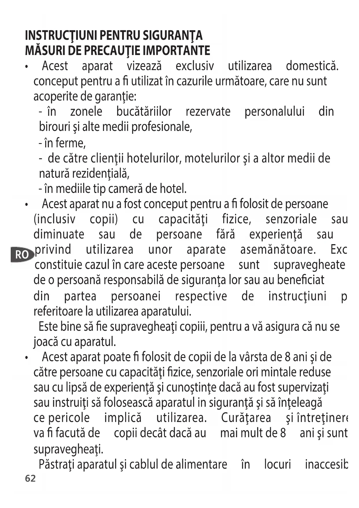 - Acestaparatnuafostconceputpentruafolositdepersoane (inclusiv copii) cu capacităţi fizice, senzoriale sau mintale diminuate sau de persoane fără experienţă sau cunoştinţe privind utilizarea unor aparate asemănătoare. Excepţie constituiecazulîncareacestepersoane sunt supravegheate deopersoanăresponsabilădesiguranţalorsauaubeneciat din partea persoanei respective de instrucţiuni prealabile referitoarelautilizareaaparatului. Estebinesăesupravegheaţicopiii,pentruavăasiguracănuse joacăcuaparatul.