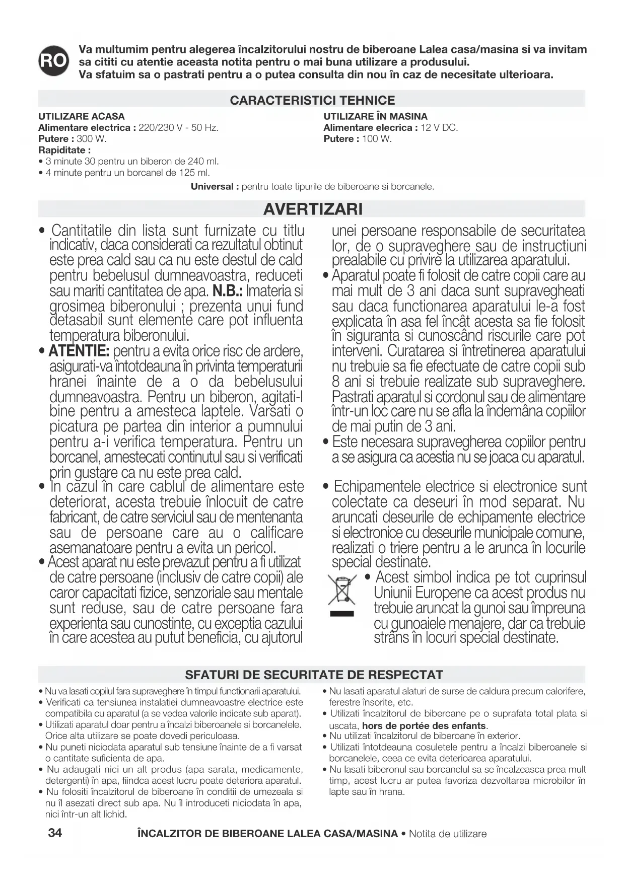 - Acest simbol indica pe tot cuprinsul Uniunii Europene ca acest produs nu trebuie aruncat la gunoi sau împreuna cu gunoaiele menajere, dar ca trebuie strâns în locuri special destinate. UTILIZARE ACASAAlimentare electrica : 220/230 V - 50 Hz.Putere : 300 W.Rapiditate :• 3 minute 30 pentru un biberon de 240 ml.• 4 minute pentru un borcanel de 125 ml.UTILIZARE ÎN MASINAAlimentare elecrica : 12 V DC.Putere : 100 W. CARACTERISTICI TEHNICE Universal : pentru toate tipurile de biberoane si borcanele.• Biberoanele sunt foarte calde în momentul în care sunt scoase din încalzitorul de biberoane. Scoateti-le cu grija.