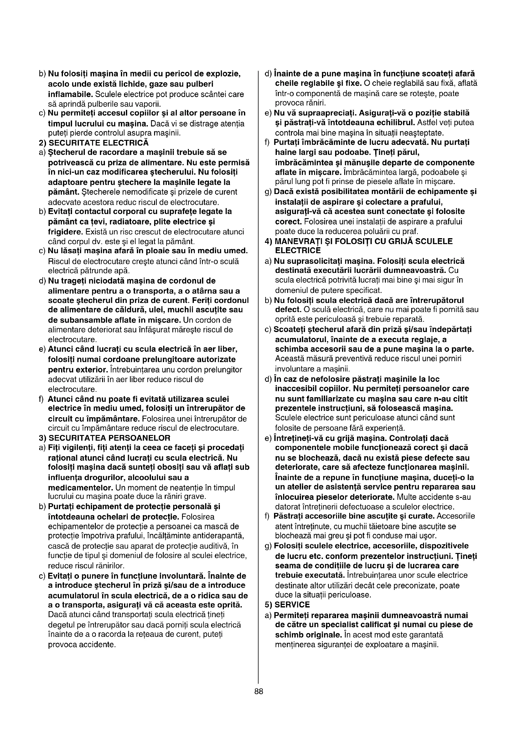 d) In caz de nefolosire păstrați masinile la loc inaccesibil copiilor. Nu permiteți personelor care nu sunt familiarizate cu masina sau care n-au citit prezentele instruciuni, să foloseasca masina. Sculele electrice sunt periculoase atunci cand sunt folosite de persone fără experientă.