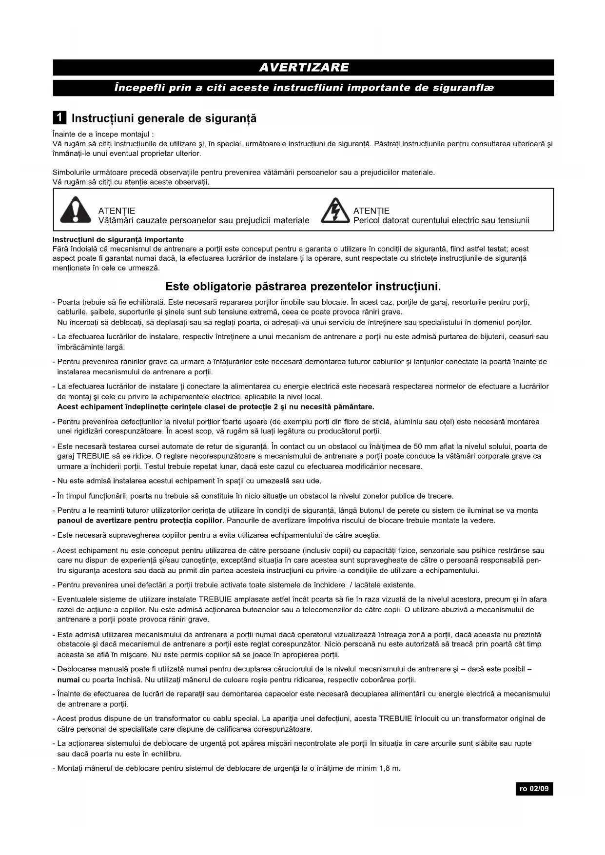 - 18 Declaraţie conformitate ro 01/09Instrucţiuni generale de siguranţă Înainte de a începe montajul : Vă rugăm să citiţi instrucţiunile de utilizare şi, în special, următoarele instrucţiuni de siguranţă. Păstraţi instrucţiunile pentru consultarea ulterioară şi înmânaţi-le unui eventual proprietar ulterior. Simbolurile următoare precedă observaţiile pentru prevenirea vătămării persoanelor sau a prejudiciilor materiale. Vă rugăm să citiţi cu atenţie aceste observaţii. Instrucţiuni de siguranţă importante Fără îndoială că mecanismul de antrenare a porţii este conceput pentru a garanta o utilizare în condiţii de siguranţă, fiind astfel testat; acest aspect poate fi garantat numai dacă, la efectuarea lucrărilor de instalare ţi la operare, sunt respectate cu stricteţe instrucţiunile de siguranţă menţionate în cele ce urmează. Este obligatorie păstrarea prezentelor instrucţiuni. - Poarta trebuie să fie echilibrată. Este necesară repararea porţilor imobile sau blocate. În acest caz, porţile de garaj, resorturile pentru porţi, cablurile, şaibele, suporturile şi şinele sunt sub tensiune extremă, ceea ce poate provoca răniri grave. Nu încercaţi să deblocaţi, să deplasaţi sau să reglaţi poarta, ci adresaţi-vă unui serviciu de întreţinere sau specialistului în domeniul porţilor. - La efectuarea lucrărilor de instalare, respectiv întreţinere a unui mecanism de antrenare a porţii nu este admisă purtarea de bijuterii, ceasuri sau îmbrăcăminte largă. - Pentru prevenirea rănirilor grave ca urmare a înfăţurărilor este necesară demontarea tuturor cablurilor şi lanţurilor conectate la poartă înainte de instalarea mecanismului de antrenare a porţii. - La efectuarea lucrărilor de instalare ţi conectare la alimentarea cu energie electrică este necesară respectarea normelor de efectuare a lucrărilor de montaj şi cele cu privire la echipamentele electrice, aplicabile la nivel local. Acest echipament îndeplineţte cerinţele clasei de protecţie 2 şi nu necesită pământare. - Pentru prevenirea defecţiunilor la nivelul porţilor foarte uşoare (de exemplu porţi din fibre de sticlă, aluminiu sau oţel) este necesară montarea unei rigidizări corespunzătoare. În acest scop, vă rugăm să luaţi legătura cu producătorul porţii. - Este necesară testarea cursei automate de retur de siguranţă. În contact cu un obstacol cu înălţimea de 50 mm aflat la nivelul solului, poarta de garaj TREBUIE să se ridice. O reglare necorespunzătoare a mecanismului de antrenare a porţii poate conduce la vătămări corporale grave ca urmare a închiderii porţii. Testul trebuie repetat lunar, dacă este cazul cu efectuarea modificărilor necesare. - Nu este admisă instalarea acestui echipament în spaţii cu umezeală sau ude. - În timpul funcţionării, poarta nu trebuie să constituie în nicio situaţie un obstacol la nivelul zonelor publice de trecere. - Pentru a le reaminti tuturor utilizatorilor cerinţa de utilizare în condiţii de siguranţă, lângă butonul de perete cu sistem de iluminat se va monta panoul de avertizare pentru protecţia copiilor. Panourile de avertizare împotriva riscului de blocare trebuie montate la vedere. - Este necesară supravegherea copiilor pentru a evita utilizarea echipamentului de către aceştia. - Acest echipament nu este conceput pentru utilizarea de către persoane (inclusiv copii) cu capacităţi fizice, senzoriale sau psihice restrânse sau care nu dispun de experienţă şi/sau cunoştinţe, exceptând situaţia în care acestea sunt supravegheate de către o persoană responsabilă pen- tru siguranţa acestora sau dacă au primit din partea acesteia instrucţiuni cu privire la condiţiile de utilizare a echipamentului. - Pentru prevenirea unei defectări a porţii trebuie activate toate sistemele de închidere / lacătele existente. - Eventualele sisteme de utilizare instalate TREBUIE amplasate astfel încât poarta să fie în raza vizuală de la nivelul acestora, precum şi în afara razei de acţiune a copiilor. Nu este admisă acţionarea butoanelor sau a telecomenzilor de către copii. O utilizare abuzivă a mecanismului de antrenare a porţii poate provoca răniri grave. - Este admisă utilizarea mecanismului de antrenare a porţii numai dacă operatorul vizualizează întreaga zonă a porţii, dacă aceasta nu prezintă obstacole şi dacă mecanismul de antrenare a porţii este reglat corespunzător. Nicio persoană nu este autorizată să treacă prin poartă cât timp aceasta se află în mişcare. Nu este permis copiilor să se joace în apropierea porţii. - Deblocarea manuală poate fi utilizată numai pentru decuplarea căruciorului de la nivelul mecanismului de antrenare şi – dacă este posibil – numai cu poarta închisă. Nu utilizaţi mânerul de culoare roşie pentru ridicarea, respectiv coborârea porţii. - Înainte de efectuarea de lucrări de reparaţii sau demontarea capacelor este necesară decuplarea alimentării cu energie electrică a mecanismului de antrenare a porţii. - Acest produs dispune de un transformator cu cablu special. La apariţia unei defecţiuni, acesta TREBUIE înlocuit cu un transformator original de către personal de specialitate care dispune de calificarea corespunzătoare. - La acţionarea sistemului de deblocare de urgenţă pot apărea mişcări necontrolate ale porţii în situaţia în care arcurile sunt slăbite sau rupte sau dacă poarta nu este în echilibru. - Montaţi mânerul de deblocare pentru sistemul de deblocare de urgenţă la o înălţime de minim 1,8 m. ATENŢIE Vătămări cauzate persoanelor sau prejudicii materiale ATENŢIE Pericol datorat curentului electric sau tensiunii p. 9