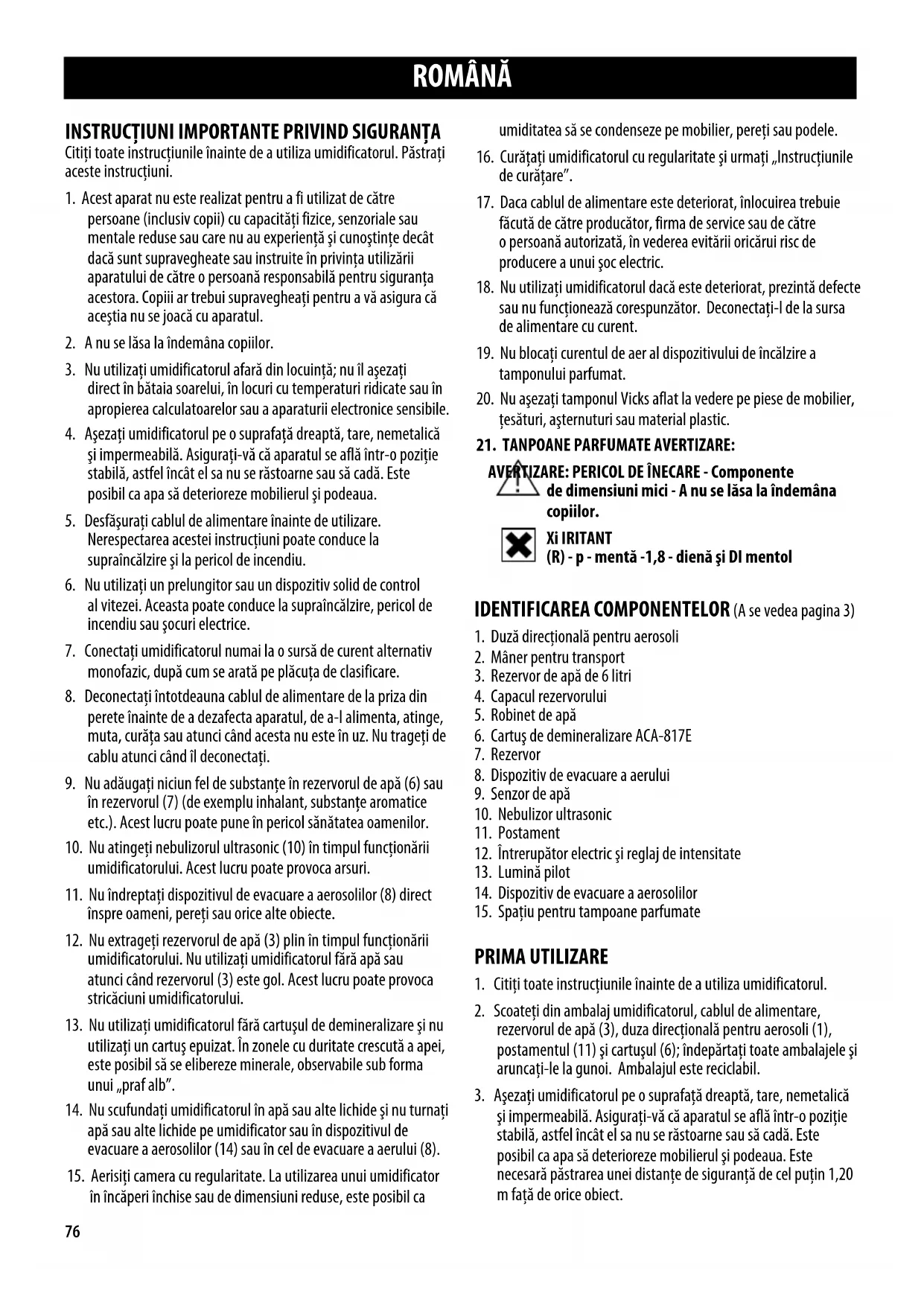 AVERTIZARE: PERICOL DE ÎNECARE - Componente de dimensiuni mici - A nu se lăsa la îndemâna copiilor. Xi IRITANT (R) - p - mentă -1,8 - dienă şi DI mentol IDENTIFICAREA COMPONENTELOR (A se vedea pagina 3)