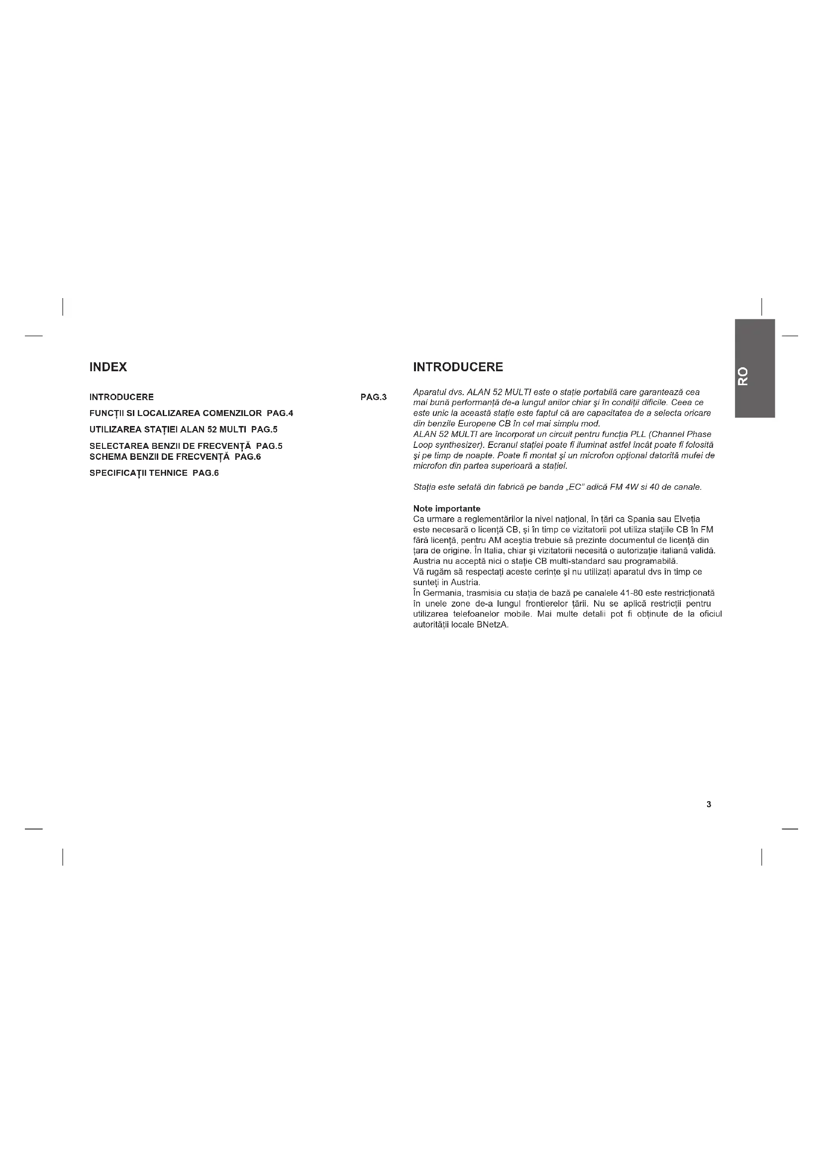 INTRODUCERE Aparatul dvs. ALAN 52 MULTI este o staţie portabilă care garantează cea mai bună performanţă de-a lungul anilor chiar şi în condiţii dicile. Ceea ce este unic la această staţie este faptul că are capacitatea de a selecta oricare din benzile Europene CB în cel mai simplu mod. ALAN 52 MULTI are încorporat un circuit pentru funcţia PLL (Channel Phase Loop synthesizer). Ecranul staţiei poate iluminat astfel încât poate folosită şi pe timp de noapte. Poate montat şi un microfon opţional datorită mufei de microfon din partea superioară a staţiei. Staţia este setată din fabrică pe banda „EC” adică FM 4W si 40 de canale. Note importante Ca urmare a reglementărilor la nivel naţional, în ţări ca Spania sau Elveţia este necesară o licenţă CB, şi în timp ce vizitatorii pot utiliza staţiile CB în FM fără licenţă, pentru AM aceştia trebuie să prezinte documentul de licenţă din ţara de origine. În Italia, chiar şi vizitatorii necesită o autorizaţie italiană validă. Austria nu acceptă nici o staţie CB multi-standard sau programabilă. Vă rugăm să respectaţi aceste cerinţe şi nu utilizaţi aparatul dvs în timp ce sunteţi in Austria. În Germania, trasmisia cu staţia de bază pe canalele 41-80 este restricţionată în unele zone de-a lungul frontierelor ţării. Nu se aplică restricţii pentru utilizarea telefoanelor mobile. Mai multe detalii pot obţinute de la ociul autorităţii locale BNetzA.4 CONŢINUT › 1 staţie CB portabilă › Încărcător de maşină cu mufă externă pentru antenă SO 239