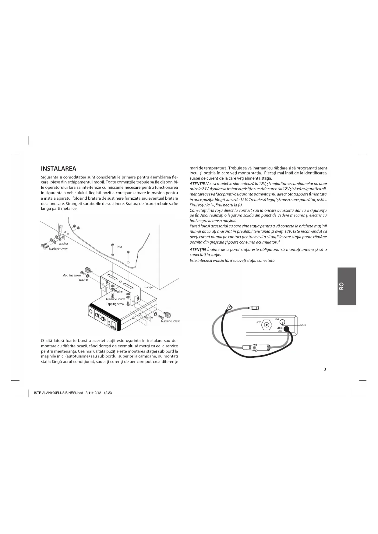 ANT EXT SPKR +RED -BLK Washer Machine screw Machine screw Washer Washer Machine screw Nut Hanger Washer Machine screw Tapping screw INSTALAREA Siguranta si comoditatea sunt consideratiile primare pentru asamblarea fie- carei piese din echipamentul mobil. Toate comenzile trebuie sa fie disponibi- le operatorului fara sa interfereze cu miscarile necesare pentru functionarea in siguranta a vehiculului. Reglati pozitia corespunzatoare in masina pentru a instala aparatul folosind bratara de sustinere furnizata sau eventual bratara de alunecare. Strangeti suruburile de sustinere. Bratara de fixare trebuie sa fie langa parti metalice. O altă latură foarte bună a acestei staţii este uşurinţa în instalare sau de- montare cu diferite ocazii, când doreşti de exemplu să mergi cu ea la service pentru mentenanţă. Cea mai uzitată poziţie este montarea staţiei sub bord la maşinile mici (autoturisme) sau sub bordul superior la camioane, nu montaţi staţia lângă aerul condiţionat, sau alţi curenţi de aer care pot crea diferenţe mari de temperatură. Trebuie sa vă înarmaţi cu răbdare şi să programaţi atent locul şi poziţia în care veţi monta staţia. Plecaţi mai întâi de la identificarea sursei de curent de la care veţi alimenta staţia. ATENTIE ! Acest model se alimentează la 12V, şi majoritatea camioanelor au doar prize la 24V. Aşadar va trebui sa găsiţi o sursă de curent la 12 V şi să vă asiguraţi ca ali- mentarea se va face printr-o siguranţă potrivită şi nu direct. Staţia poate fi montată în orice poziţie lângă sursa de 12 V. Trebuie să legaţi şi masa corespunzător, astfel: Firul roşu la (+)firul negru la (-). Conectaţi firul roşu direct la contact sau la oricare accesoriu dar cu o siguranţa pe fir. Apoi realizaţi o legătură solidă din punct de vedere mecanic şi electric cu firul negru la masa maşinii. Puteţi folosi accesoriul cu care vine staţia pentru a vă conecta la bricheta maşinii numai daca aţi măsurat în prealabil tensiunea şi aveţi 12V. Este recomandat să aveţi curent numai pe contact pentru a evita situaţii în care staţia poate rămâne pornită din greşeală şi poate consuma acumulatorul. ATENŢIE! Înainte de a porni staţia este obligatoriu să montaţi antena şi să o conectaţi la staţie. Este interzisă emisia fără sa aveţi staţia conectată. ISTR ALAN100PLUS B NEW.indd 3 11/12/12 12.234 ÎNLOCUIREA SIGURANŢEI: Dacă trebuie să înlocuiţi siguranţa, înlocuiţi cu una de 2A. Trebuie ţinută siguranţa în mână se apasă şi apoi se roteşte uşor spre stânga pentru desfa- cere.