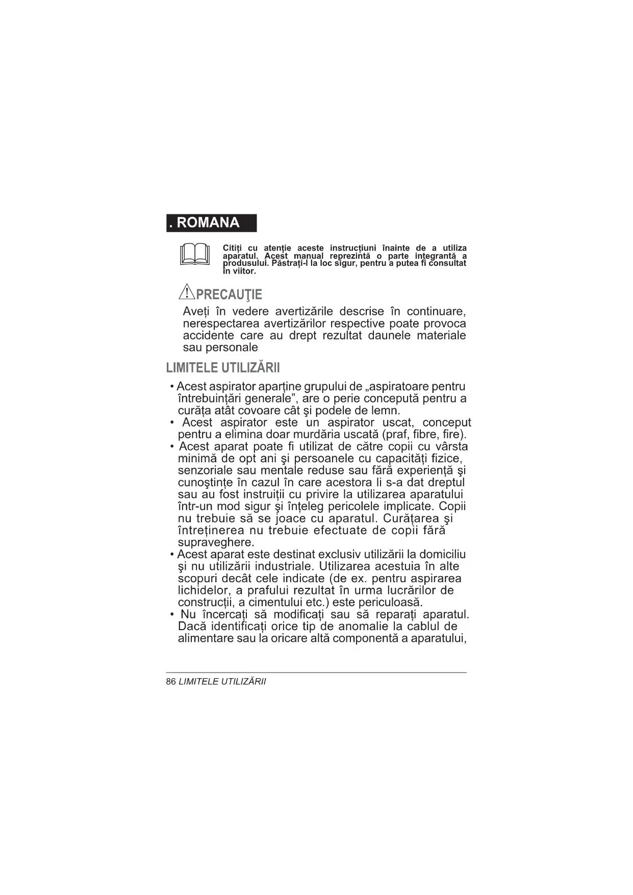 - Acest aparat este destinat exclusiv utiliz¡rii la domiciliu ¢i nu utiliz¡rii industriale. Utilizarea acestuia în alte scopuri decât cele indicate (de ex. pentru aspirarea lichidelor, a prafului rezultat în urma lucr¡rilor de construcii, a cimentului etc.) este periculoas¡.