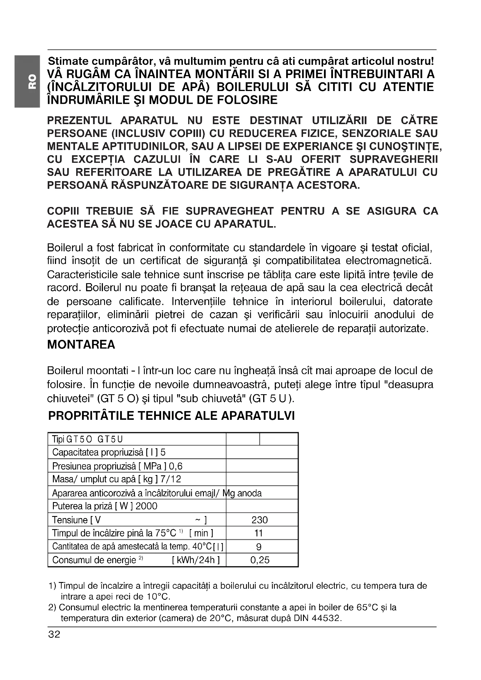Boilerul a fost fabricat în conformitate cu standardele în vigoare şi testat oficial, fiind însoţit de un certificat de siguranţă şi compatibilitatea electromagnetică. Caracteristicile sale tehnice sunt înscrise pe tăbliţa care este lipită între ţevile de racord. Boilerul nu poate fi branşat la reţeaua de apă sau la cea electrică decât de persoane calificate. Intervenţiile tehnice în interiorul boilerului, datorate reparaţiilor, eliminării pietrei de cazan şi verificării sau înlocuirii anodului de protecţie anticorozivă pot fi efectuate numai de atelierele de reparaţii autorizate. MONTAREA Boilerul moontati - l într-un loc care nu îngheaţă însâ cît mai aproape de locul de folosire. În funcţie de nevoile dumneavoastrâ, puteţi alege între tîpul "deasupra