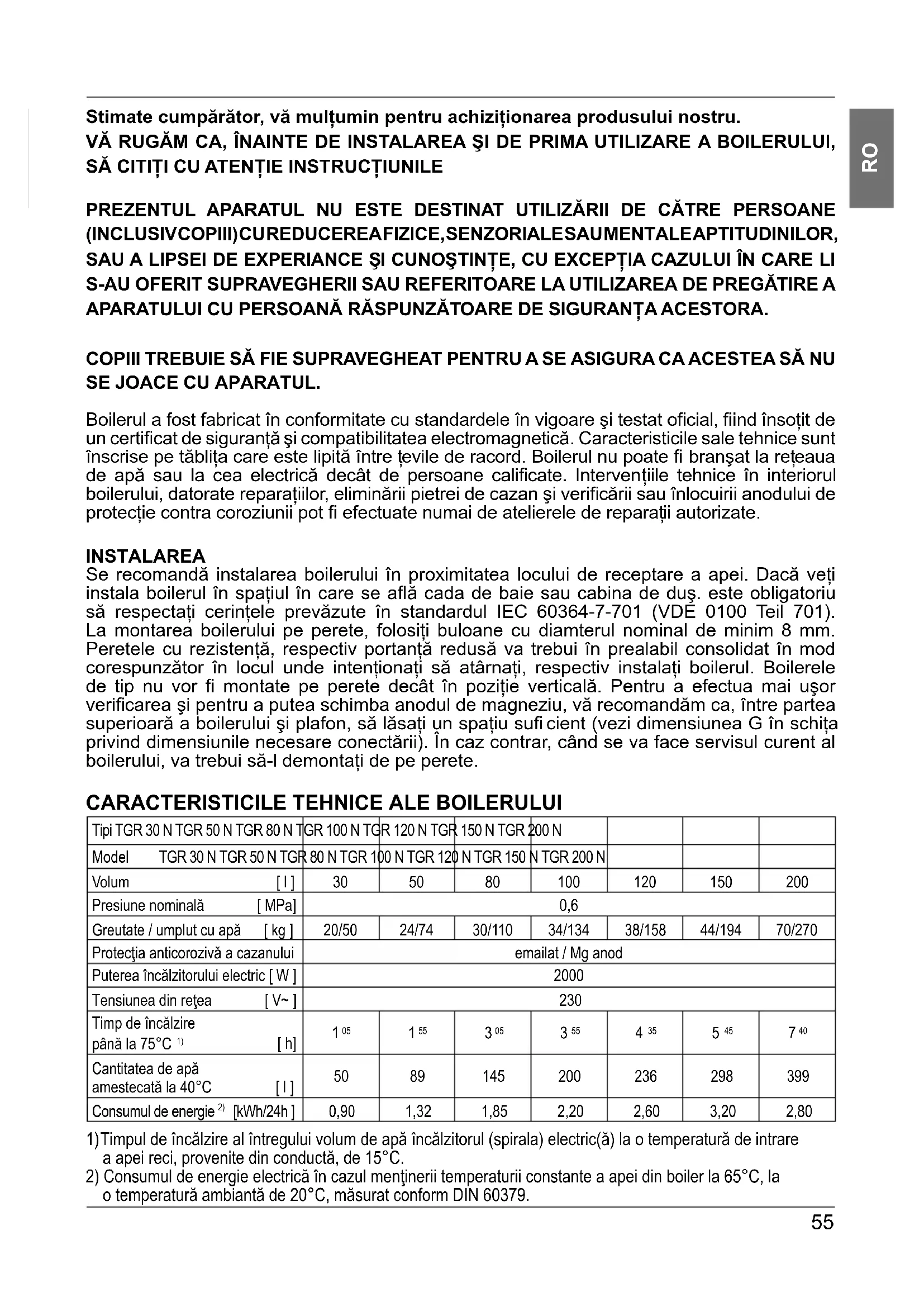 Stimate cumpărător, vă mulţumin pentru achiziţionarea produsului nostru. VĂ RUGĂM CA, ÎNAINTE DE INSTALAREA Şl DE PRIMA UTILIZARE A BOILERULUI, SĂ CITIŢI CU ATENŢIE INSTRUCŢIUNILE PREZENTUL APARATUL NU ESTE DESTINAT UTILIZĂRII DE CĂTRE PERSOANE (INCLUSIV COPIII) CU REDUCEREA FIZICE, SENZORIALE SAU MENTALE APTITUDINILOR, SAU A LIPSEI DE EXPERIANCE ŞI CUNOŞTINŢE, CU EXCEPŢIA CAZULUI ÎN CARE LI S-AU OFERIT SUPRAVEGHERII SAU REFERITOARE LA UTILIZAREA DE PREGĂTIRE A APARATULUI CU PERSOANĂ RĂSPUNZĂTOARE DE SIGURANŢA ACESTORA. COPIII TREBUIE SĂ FIE SUPRAVEGHEAT PENTRU A SE ASIGURA CA ACESTEA SĂ NU SE JOACE CU APARATUL. Boilerul a fost fabricat în conformitate cu standardele în vigoare şi testat ofi cial, fi ind însoţit de un certifi cat de siguranţă şi compatibilitatea electromagnetică. Caracteristicile sale tehnice sunt înscrise pe tăbliţa care este lipită între ţevile de racord. Boilerul nu poate fi branşat la reţeaua de apă sau la cea electrică decât de persoane califi cate. Interven ţiile tehnice în interiorul boilerului, datorate reparaţiilor, eliminării pietrei de cazan şi verifi cării sau înlocuirii anodului de protecţie contra coroziunii pot fi efectuate numai de atelierele de reparaţii autorizate. INSTALAREA Se recomandă instalarea boilerului în proximitatea locului de receptare a apei. Dacă veţi instala boilerul în spaţiul în care se afl ă cada de baie sau cabina de duş. este obligatoriu să respectaţi cerinţele prevăzute în standardul IEC 60364-7-701 (VDE 0100 Teil 701). La montarea boilerului pe perete, folosiţi buloane cu diamterul nominal de minim 8 mm. Peretele cu rezistenţă, respectiv portanţă redusă va trebui în prealabil consolidat în mod corespunzător în locul unde intenţionaţi să atârnaţi, respectiv instalaţi boilerul. Boilerele de tip nu vor fi montate pe perete decât în poziţie verticală. Pentru a efectua mai uşor verifi carea şi pentru a putea schimba anodul de magneziu, vă recomandăm ca, între partea superioară a boilerului şi plafon, să lăsaţi un spaţiu sufi cient (vezi dimensiunea G în schiţa privind dimensiunile necesare conectării). În caz contrar, când se va face servisul curent al boilerului, va trebui să-l demontaţi de pe perete.