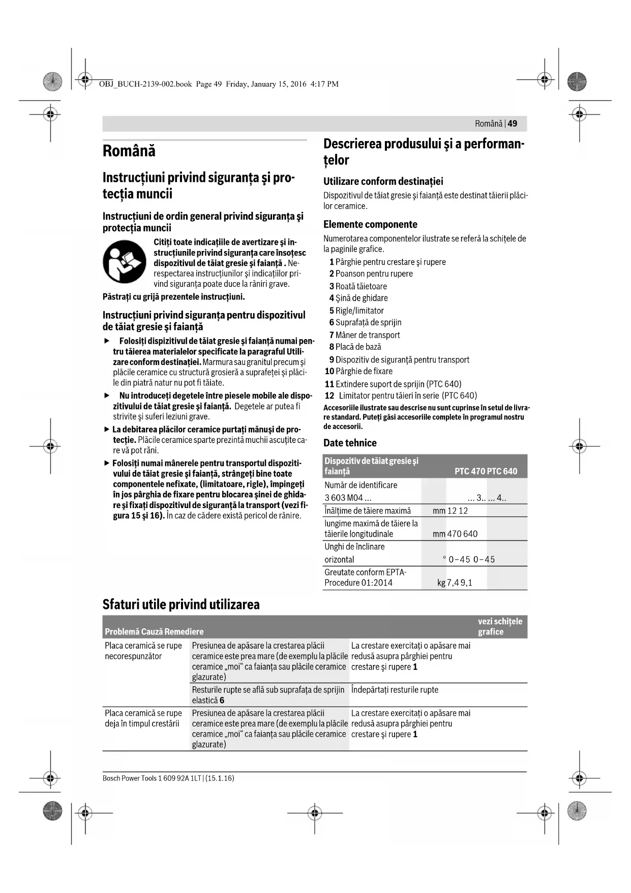 Плитканы оюда қысым тым жоғары Оюда ою мен сындыру тұтқышына 1 төменірек қысым салыңыз OBJ_BUCH-2139-002.book Page 48 Friday, January 15, 2016 4:17 PMRomână | 49 Bosch Power Tools 1 609 92A 1LT | (15.1.16) Română Instrucţiuni privind siguranţa şi pro- tecţia muncii Instrucţiuni de ordin general privind siguranţa şi protecţia muncii Citiţi toate indicaţiile de avertizare şi in- strucţiunile privind siguranţa care însoţesc dispozitivul de tăiat gresie şi faianţă . Ne- respectarea instrucţiunilor şi indicaţiilor pri- vind siguranţa poate duce la răniri grave. Păstraţi cu grijă prezentele instrucţiuni. Instrucţiuni privind siguranţa pentru dispozitivul de tăiat gresie şi faianţă Folosiţi dispizitivul de tăiat gresie şi faianţă numai pen- tru tăierea materialelor specificate la paragraful Utili- zare conform destinaţiei. Marmura sau granitul precum şi plăcile ceramice cu structură grosieră a suprafeţei şi plăci- le din piatră natur nu pot fi tăiate. Nu introduceţi degetele între piesele mobile ale dispo- zitivului de tăiat gresie şi faianţă. Degetele ar putea fi strivite şi suferi leziuni grave. La debitarea plăcilor ceramice purtaţi mănuşi de pro- tecţie. Plăcile ceramice sparte prezintă muchii ascuţite ca- re vă pot răni. Folosiţi numai mânerele pentru transportul dispoziti- vului de tăiat gresie şi faianţă, strângeţi bine toate componentele nefixate, (limitatoare, rigle), împingeţi în jos pârghia de fixare pentru blocarea şinei de ghida- re şi fixaţi dispozitivul de siguranţă la transport (vezi fi- gura 15 şi 16). În caz de cădere există pericol de rănire. Descrierea produsului şi a performan- ţelor Utilizare conform destinaţiei Dispozitivul de tăiat gresie şi faianţă este destinat tăierii plăci- lor ceramice. Elemente componente Numerotarea componentelor ilustrate se referă la schiţele de la paginile grafice. 1 Pârghie pentru crestare şi rupere 2 Poanson pentru rupere 3 Roată tăietoare 4 Şină de ghidare 5 Rigle/limitator 6 Suprafaţă de sprijin 7 Mâner de transport 8 Placă de bază 9 Dispozitiv de siguranţă pentru transport 10 Pârghie de fixare 11 Extindere suport de sprijin (PTC 640) 12 Limitator pentru tăieri în serie (PTC 640) Accesoriile ilustrate sau descrise nu sunt cuprinse în setul de livra-re standard. Puteţi găsi accesoriile complete în programul nostru de accesorii. Date tehnice Sfaturi utile privind utilizarea Dispozitiv de tăiat gresie şi faianţă PTC 470 PTC 640 Număr de identificare 3 603 M04 ...