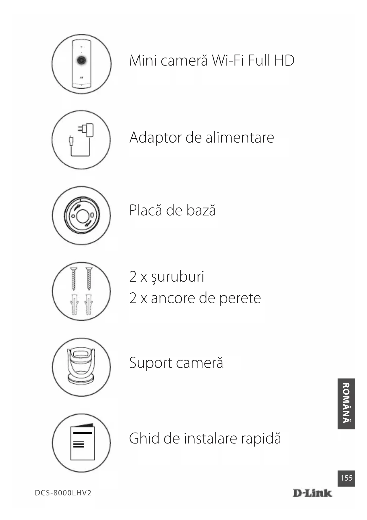 ROMÂNĂ Ghid de instalare rapidă Adaptor de alimentare Mini cameră Wi-Fi Full HD 2 x șuruburi 2 x ancore de perete Suport cameră Placă de bazăDCS-8000LHV2 ROMÂNĂ Căutați mydlink și descărcați aplicația. Notă: Acest produs este incompatibil cu alte aplicații mydlink, cum sunt ‘mydlink Home,’ ‘mydlink Lite’ etc. Descărcați aplicația