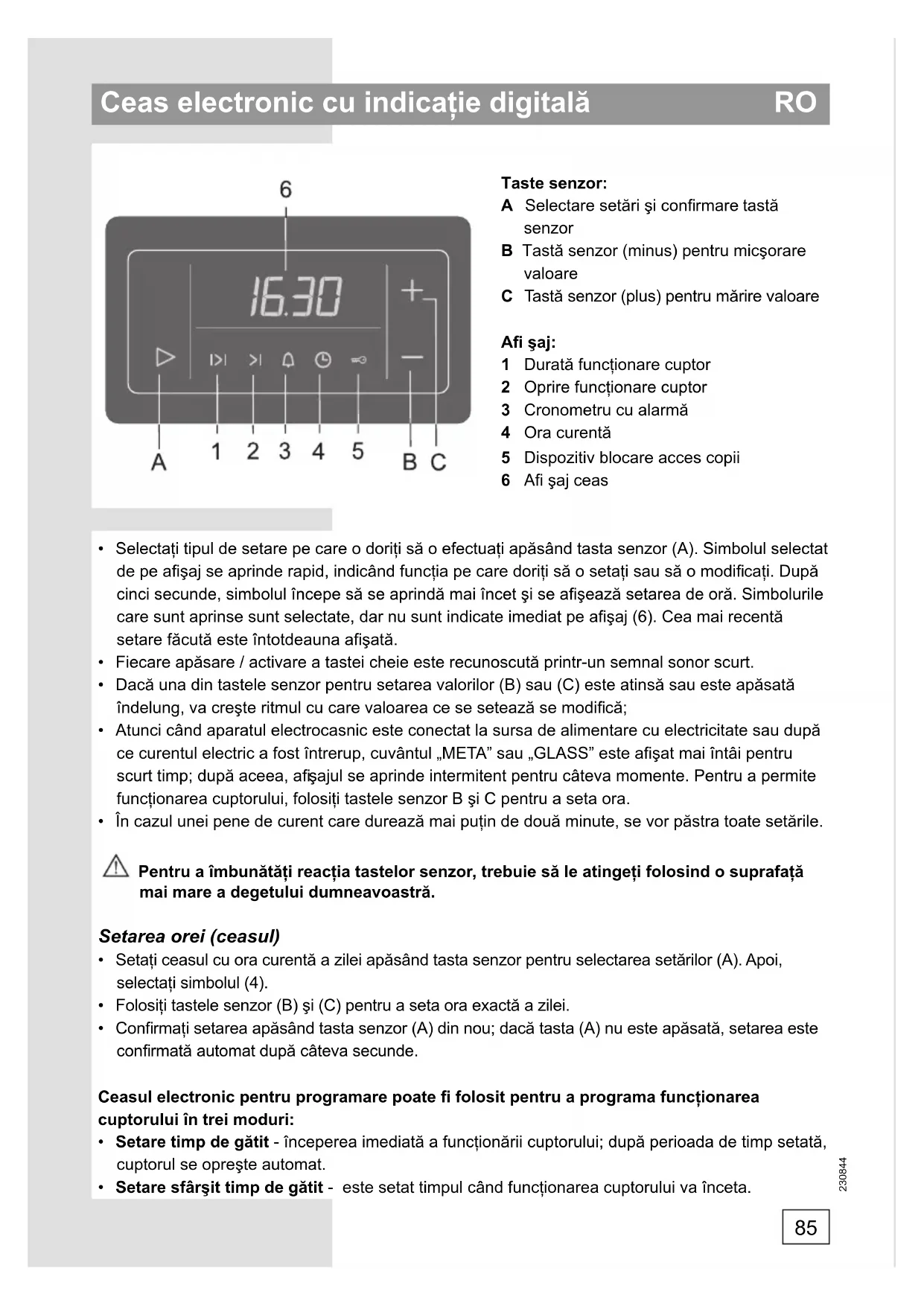 Taste senzor: A Selectare setări şi confi rmare tastă senzor B Tastă senzor (minus) pentru micşorare valoare C Tastă senzor (plus) pentru mărire valoare Afi şaj: 1 Durată funcţionare cuptor 2 Oprire funcţionare cuptor 3 Cronometru cu alarmă 4 Ora curentă 5 Dispozitiv blocare acces copii 6 Afi şaj ceas