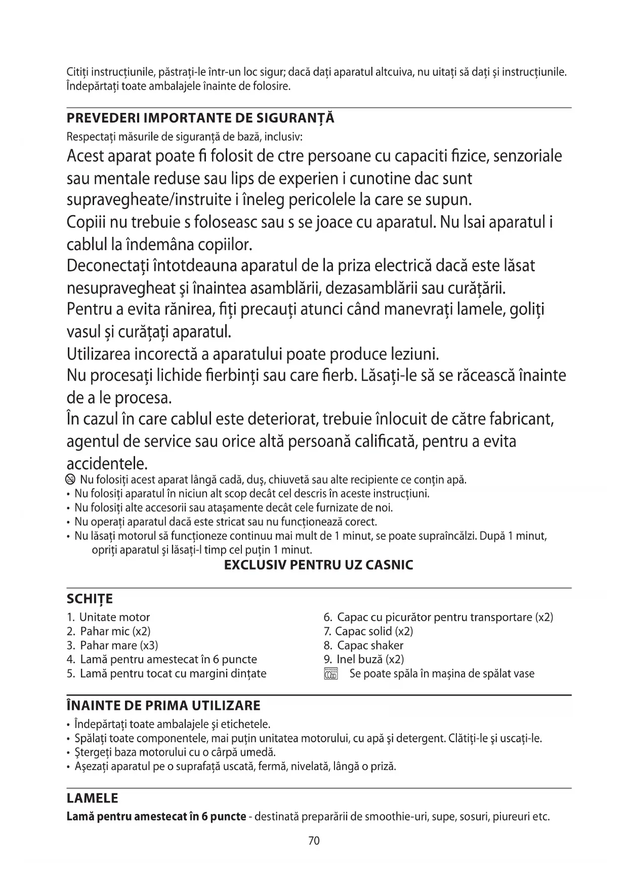 Respectaţi măsurile de siguranţă de bază, inclusiv: Acest aparat poate folosit de ctre persoane cu capaciti zice, senzoriale sau mentale reduse sau lips de experien i cunotine dac sunt supravegheate/instruite i îneleg pericolele la care se supun. Copiii nu trebuie s foloseasc sau s se joace cu aparatul. Nu lsai aparatul i cablul la îndemâna copiilor. Deconectaţi întotdeauna aparatul de la priza electrică dacă este lăsat nesupravegheat şi înaintea asamblării, dezasamblării sau curăţării. Pentru a evita rănirea, ți precauți atunci când manevrați lamele, goliți vasul și curățați aparatul. Utilizarea incorectă a aparatului poate produce leziuni. Nu procesați lichide erbinți sau care erb. Lăsați-le să se răcească înainte de a le procesa. În cazul în care cablul este deteriorat, trebuie înlocuit de către fabricant, agentul de service sau orice altă persoană calicată, pentru a evita accidentele. b Nu folosiţi acest aparat lângă cadă, duş, chiuvetă sau alte recipiente ce conţin apă.