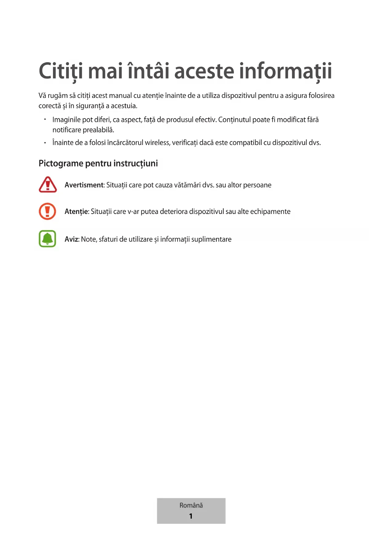 Înainte de a folosi încărcătorul wireless, verificați dacă este compatibil cu dispozitivul dvs. Pictograme pentru instrucţiuni Avertisment: Situaţii care pot cauza vătămări dvs. sau altor persoane Atenţie: Situaţii care v-ar putea deteriora dispozitivul sau alte echipamente Aviz: Note, sfaturi de utilizare şi informaţii suplimentare Română