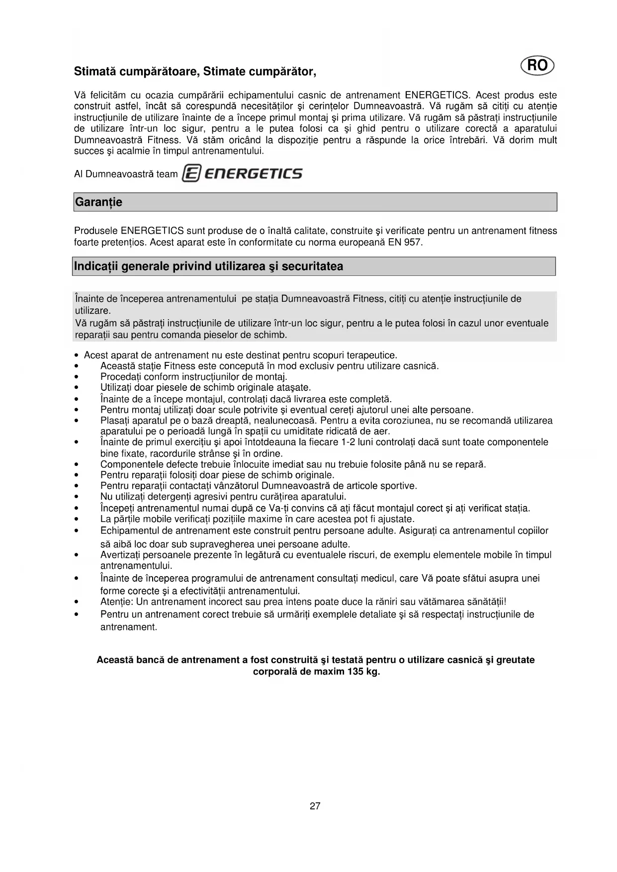 Stimată cumpărătoare, Stimate cumpărător, Vă felicităm cu ocazia cumpărării echipamentului casnic de antrenament ENERGETICS. Acest produs este construit astfel, încât să corespundă necesităŃilor şi cerinŃelor Dumneavoastră. Vă rugăm să citiŃi cu atenŃie instrucŃiunile de utilizare înainte de a începe primul montaj şi prima utilizare. Vă rugăm să păstraŃi instrucŃiunile de utilizare într-un loc sigur, pentru a le putea folosi ca şi ghid pentru o utilizare corectă a aparatului Dumneavoastră Fitness. Vă stăm oricând la dispoziŃie pentru a răspunde la orice întrebări. Vă dorim mult succes şi acalmie în timpul antrenamentului. Al Dumneavoastră team GaranŃie